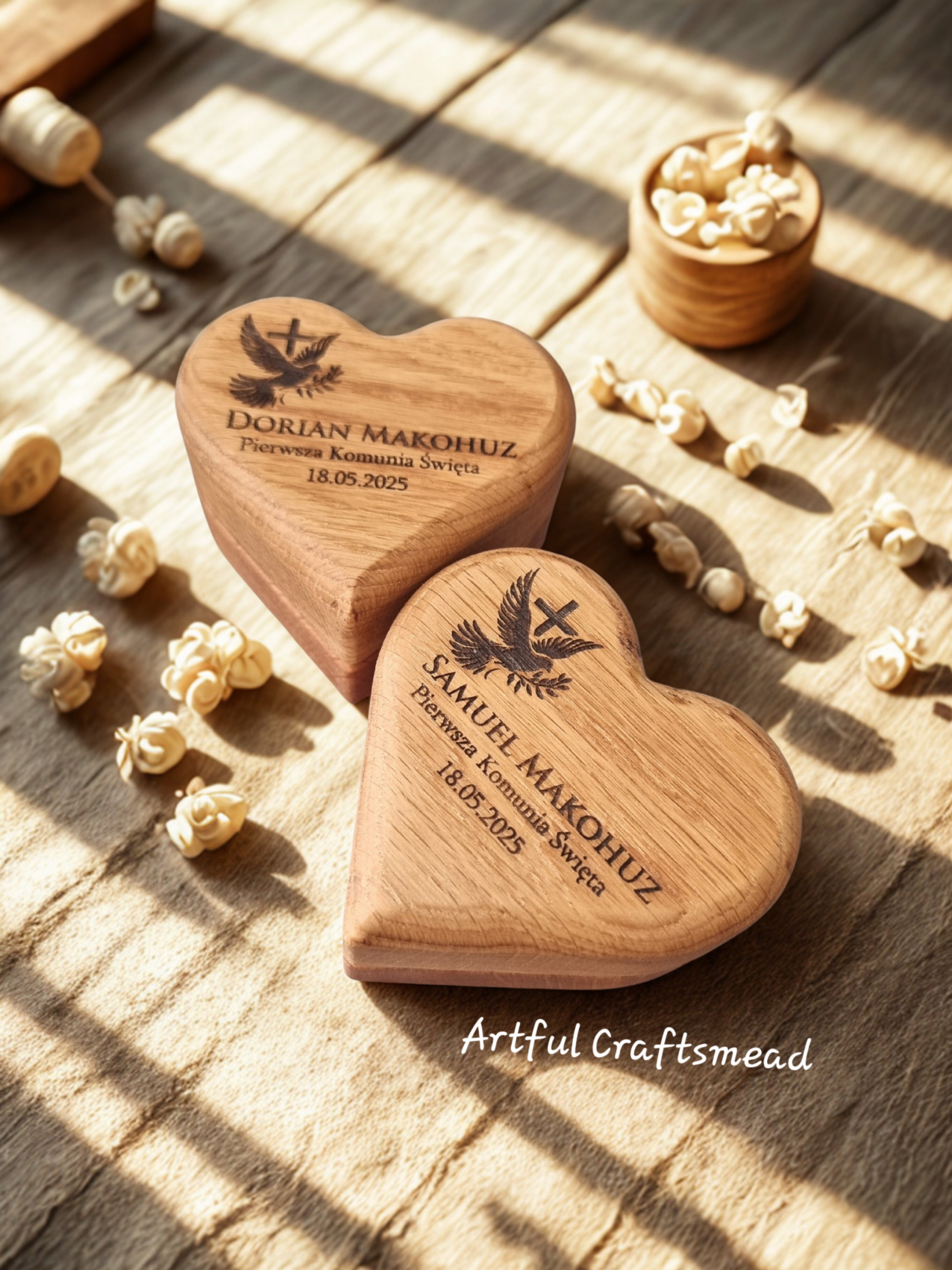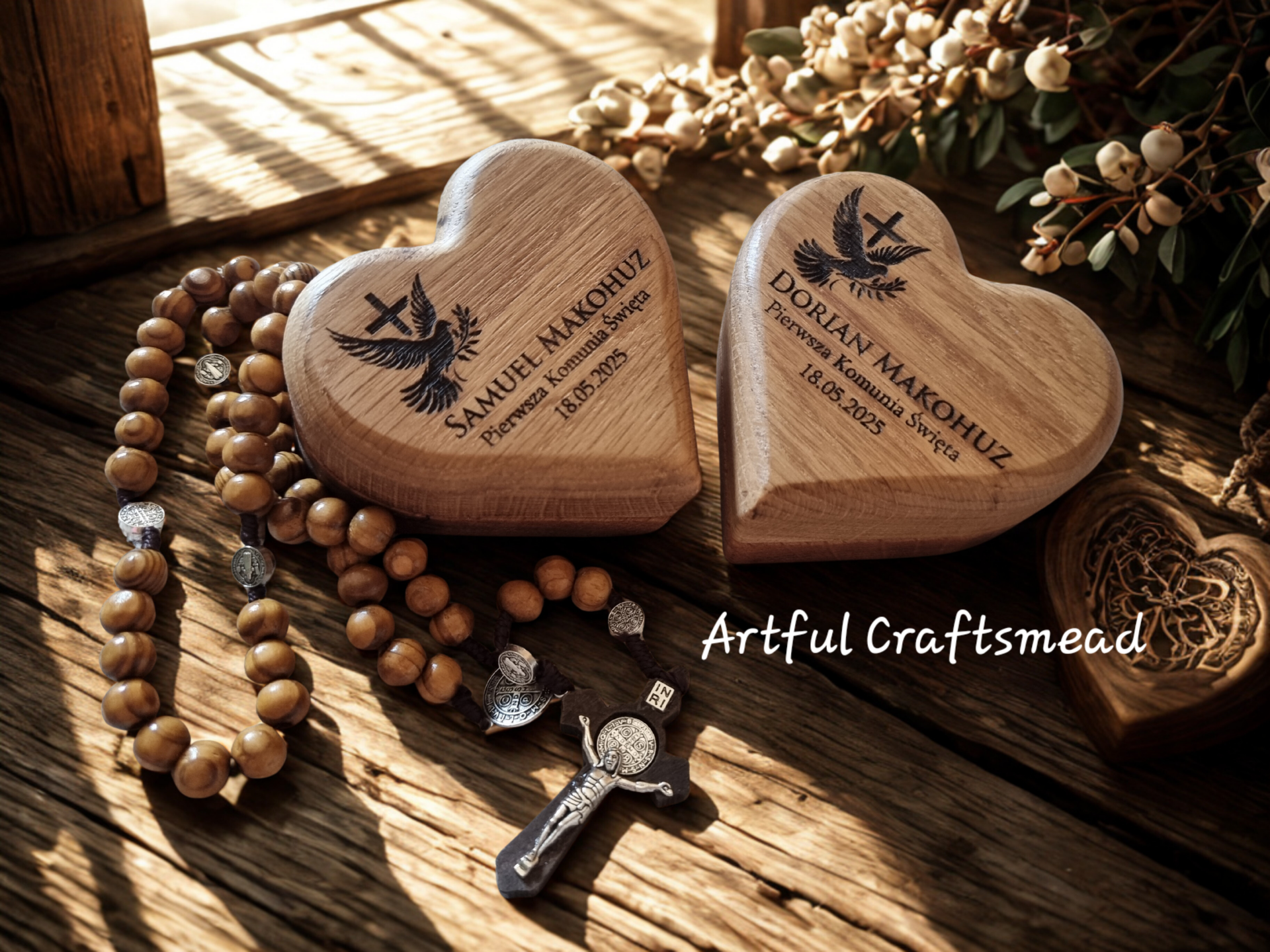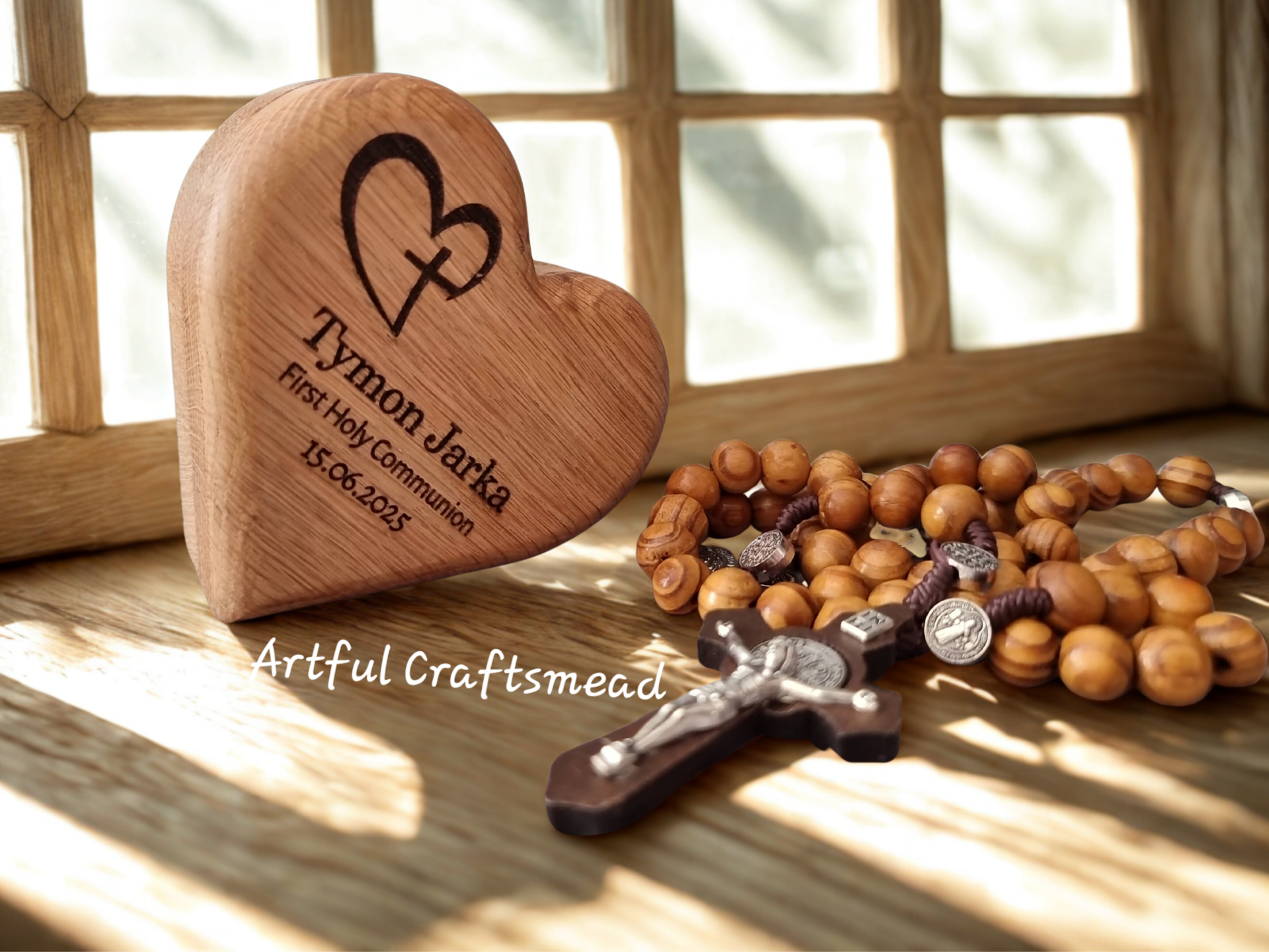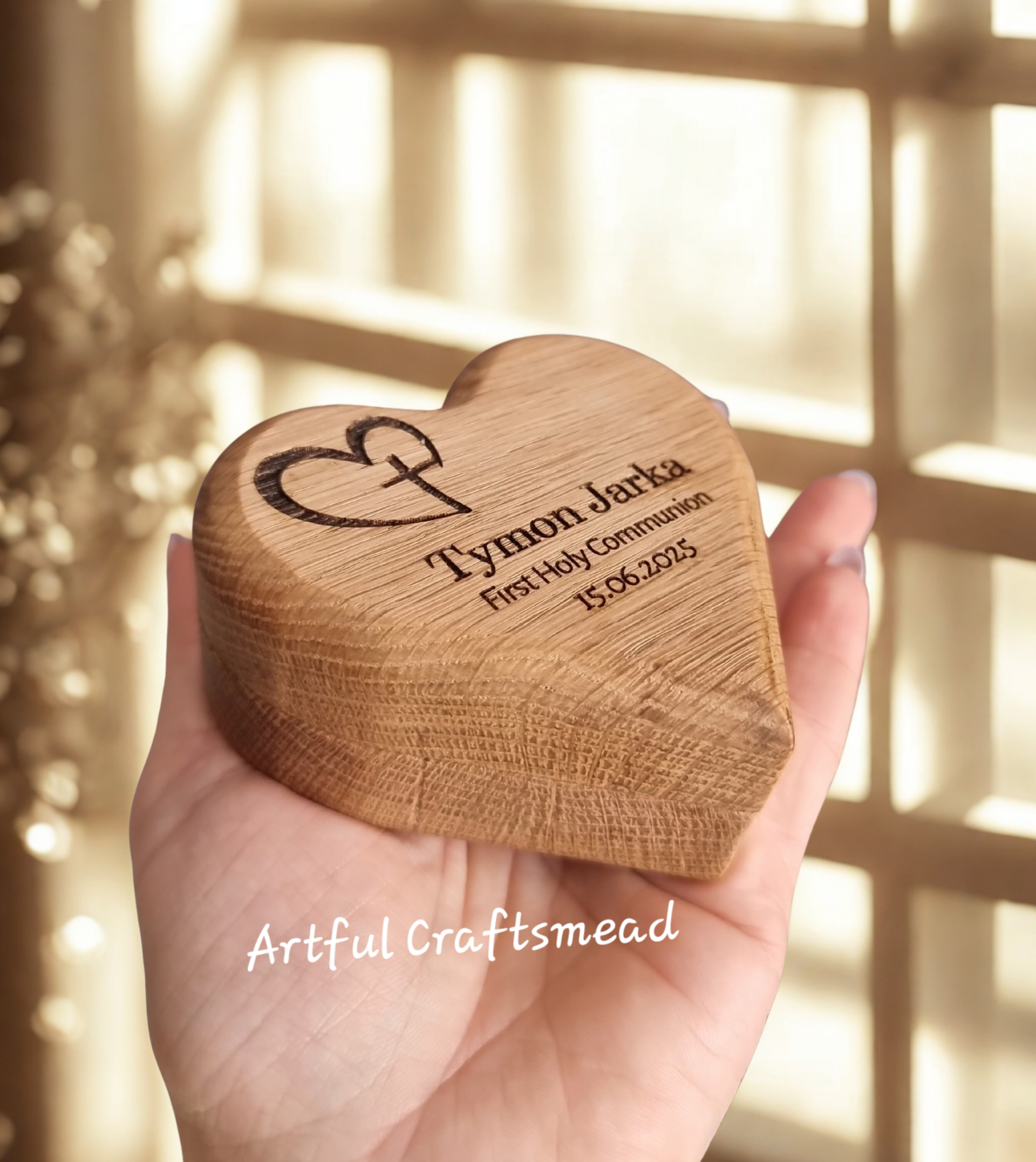 Personalised Solid Oak Heart Box | Handmade Rosary Box | Engraved Wooden Keepsake | First Holy Communion Gift