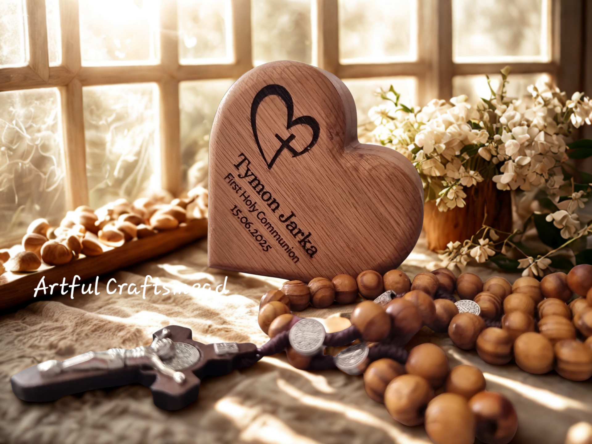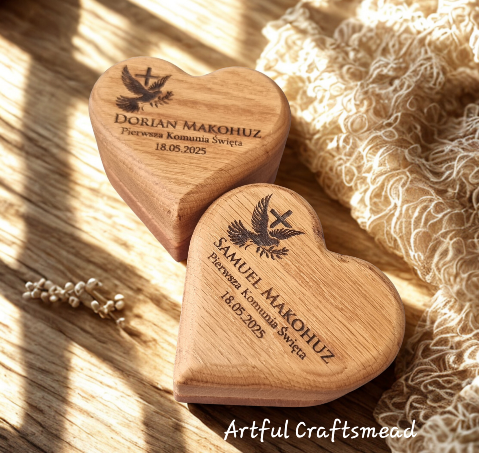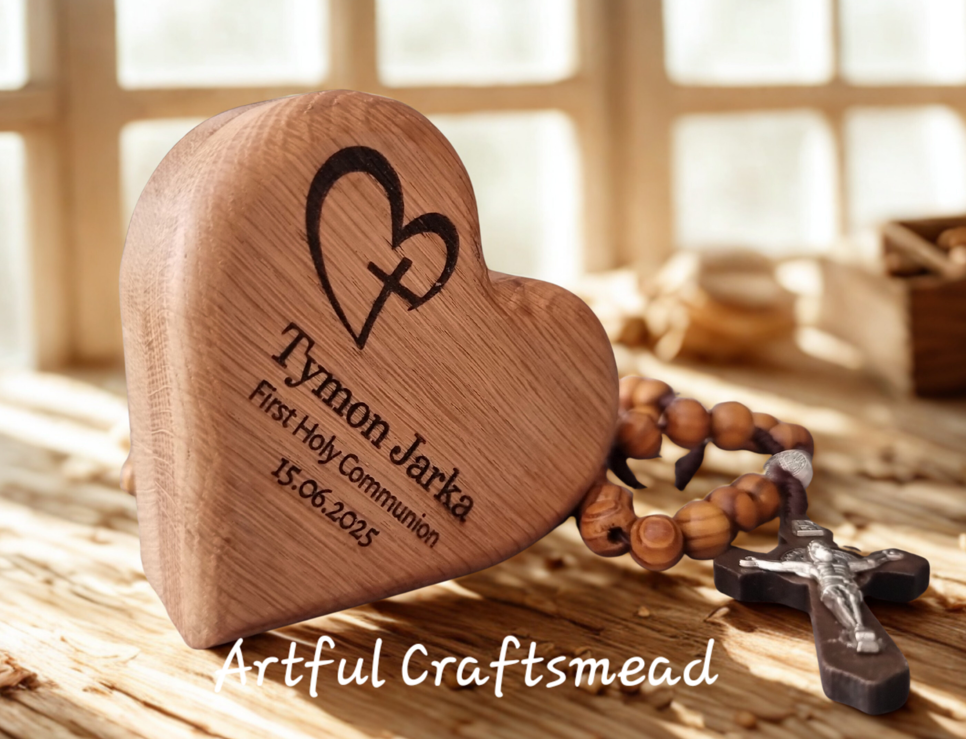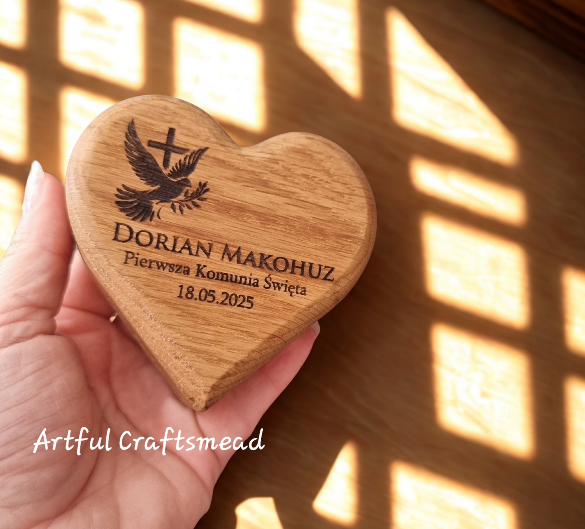 Personalised Solid Oak Heart Box | Handmade Rosary Box | Engraved Wooden Keepsake | First Holy Communion Gift
