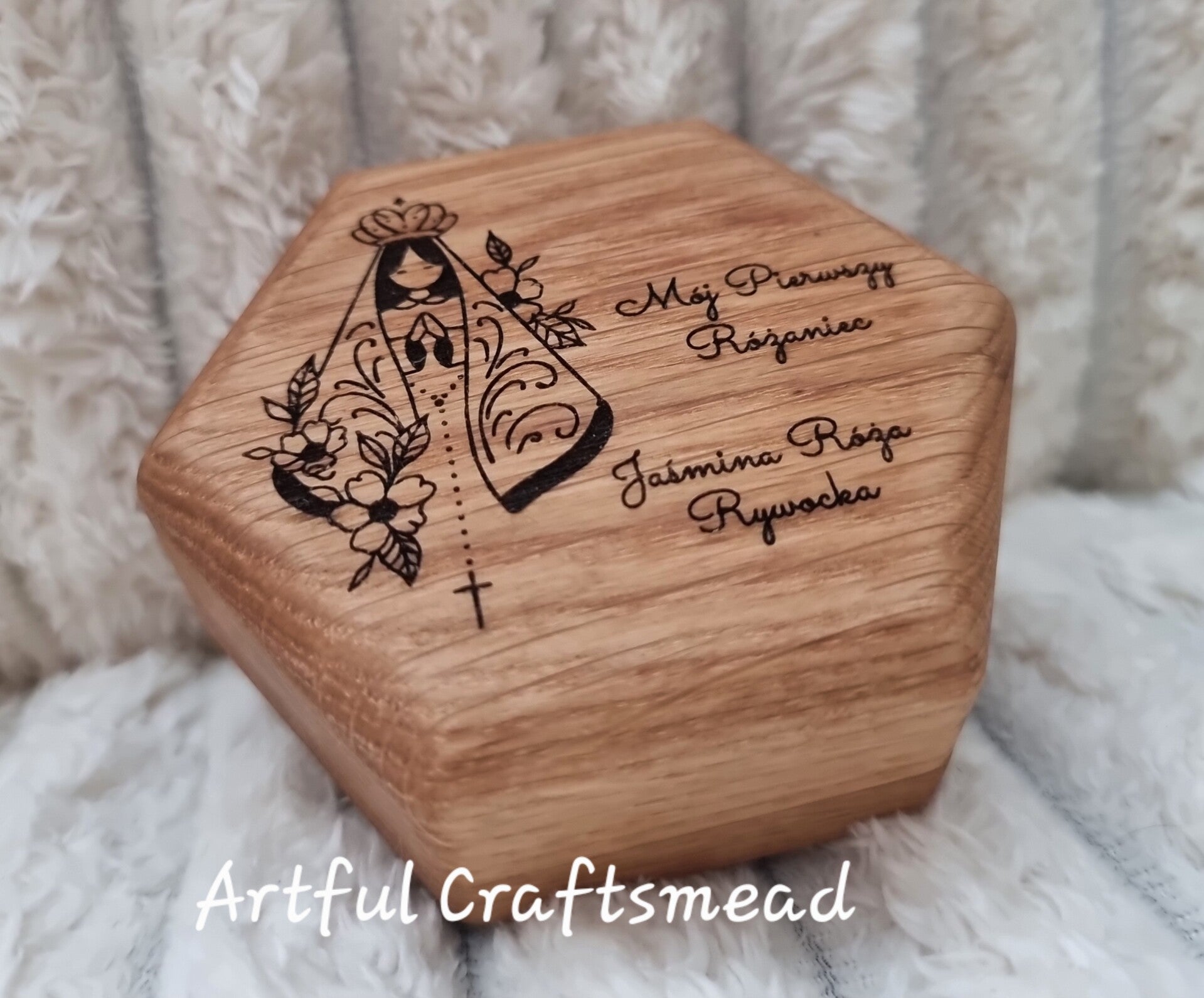 Hello, lovely gift-givers! 😊 Are you searching for a unique and heartfelt gift that will be treasured for generations? Our **Beautiful Hexagon Rosary Box** is here to captivate your heart. Crafted with love from solid oak, this charming hexagon-shaped box features a stunning laser-engraved image of the Blessed Virgin Mary with a rosary. ✨📿 Rosary not included!!!