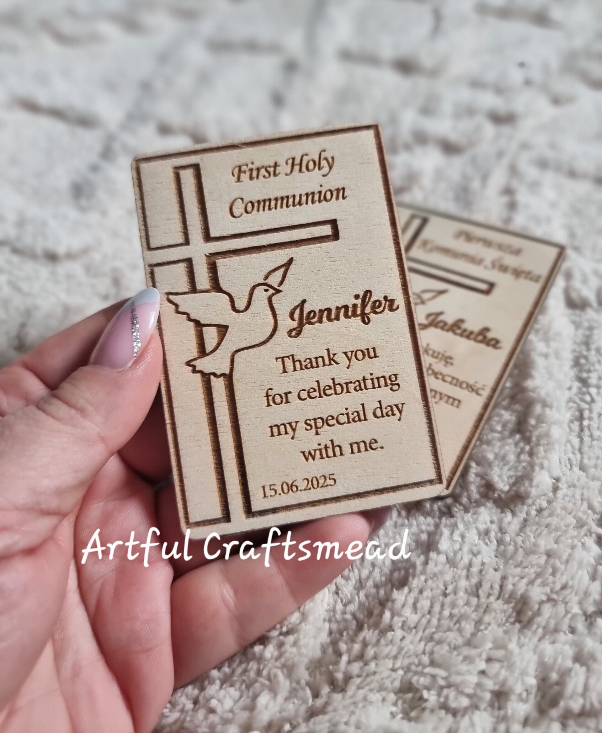 Witajcie, wspaniali klienci! 😊 Czy szukacie wyjątkowego i znaczącego sposobu, aby wyrazić swoją wdzięczność? Nasze **Magnesy z podziękowaniami** są idealne na każdą specjalną okazję! Te pięknie wykonane magnesy mają krzyż płynnie zintegrowany z wzorem, do którego zbliża się gołąb. Obok krzyża znajduje się grawerunek umożliwiający personalizację, dzięki czemu każdy magnes staje się wyjątkową pamiątką. 🕊️✝️