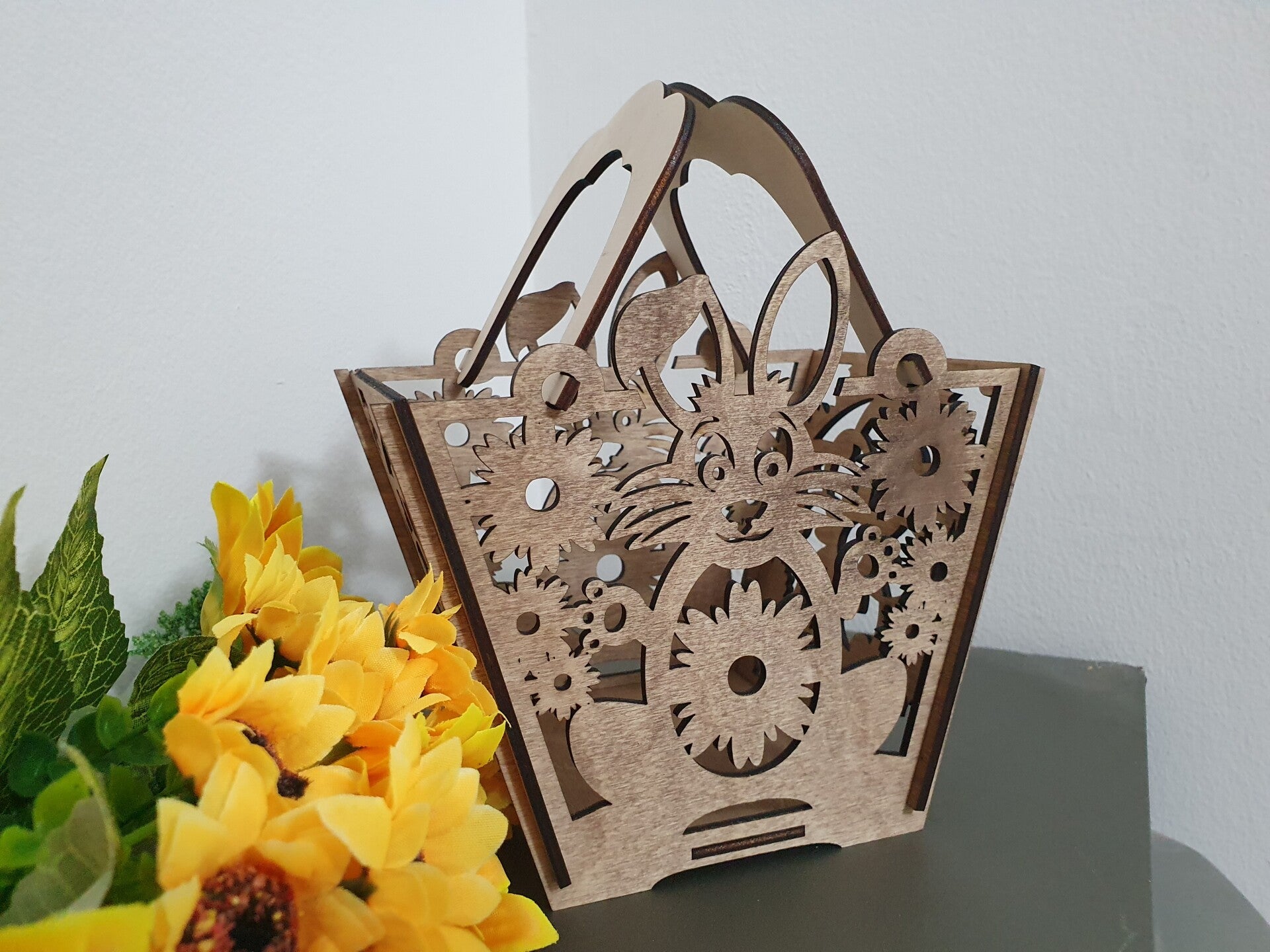 - Ten piękny drewniany koszyk jest grawerowany laserowo i idealnie nadaje się na wszystkie te pyszne wielkanocne smakołyki.