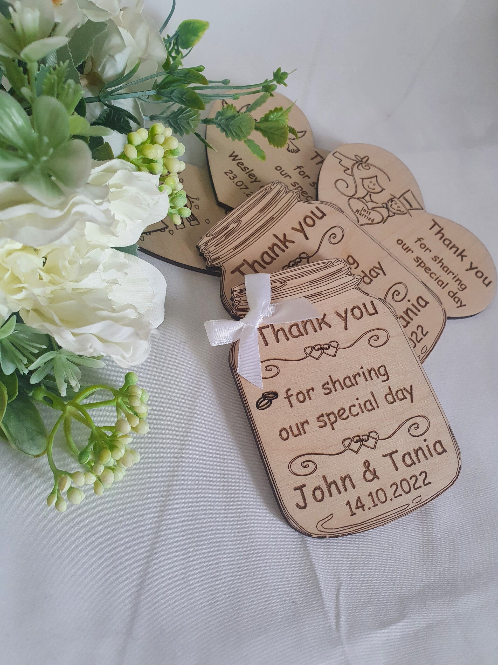 Imagine this: a delightful jar-shaped magnet, topped with an adorable little white bow. Inside, your names and wedding date are beautifully personalized, along with the heartfelt message "Thank you for sharing our special day." 🥰💌