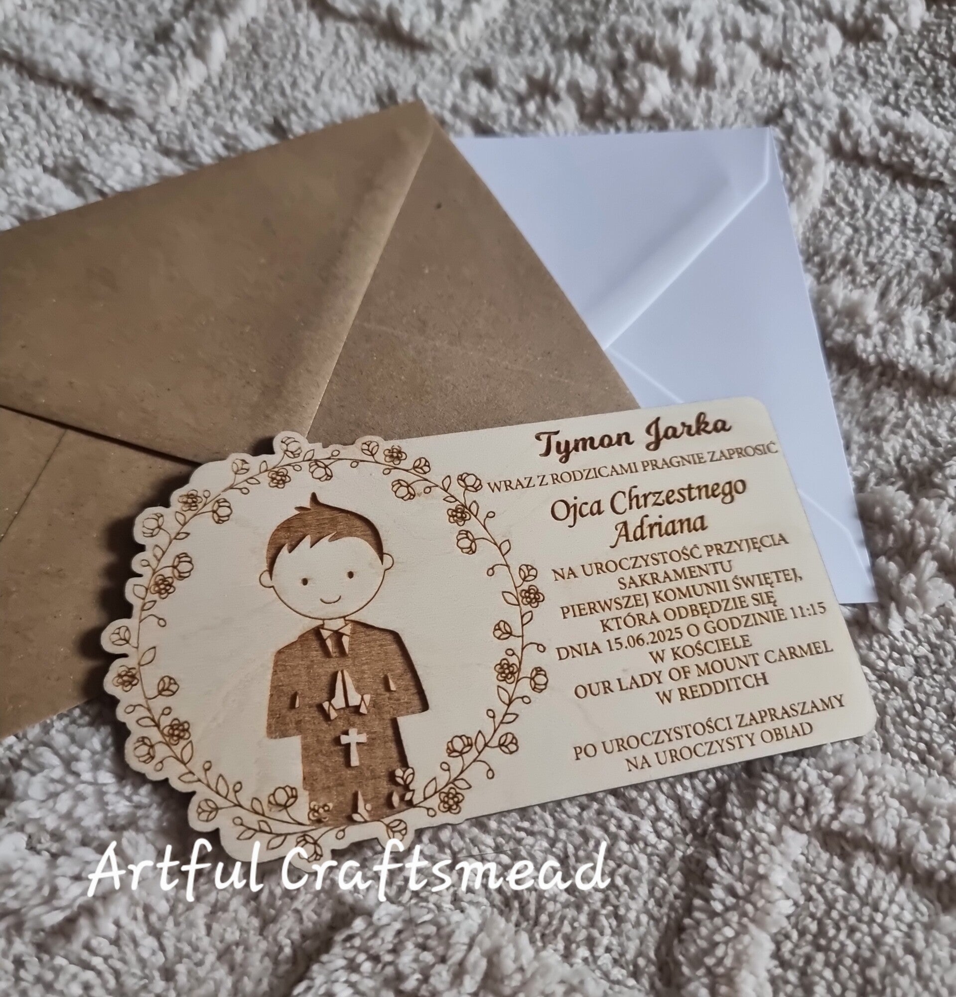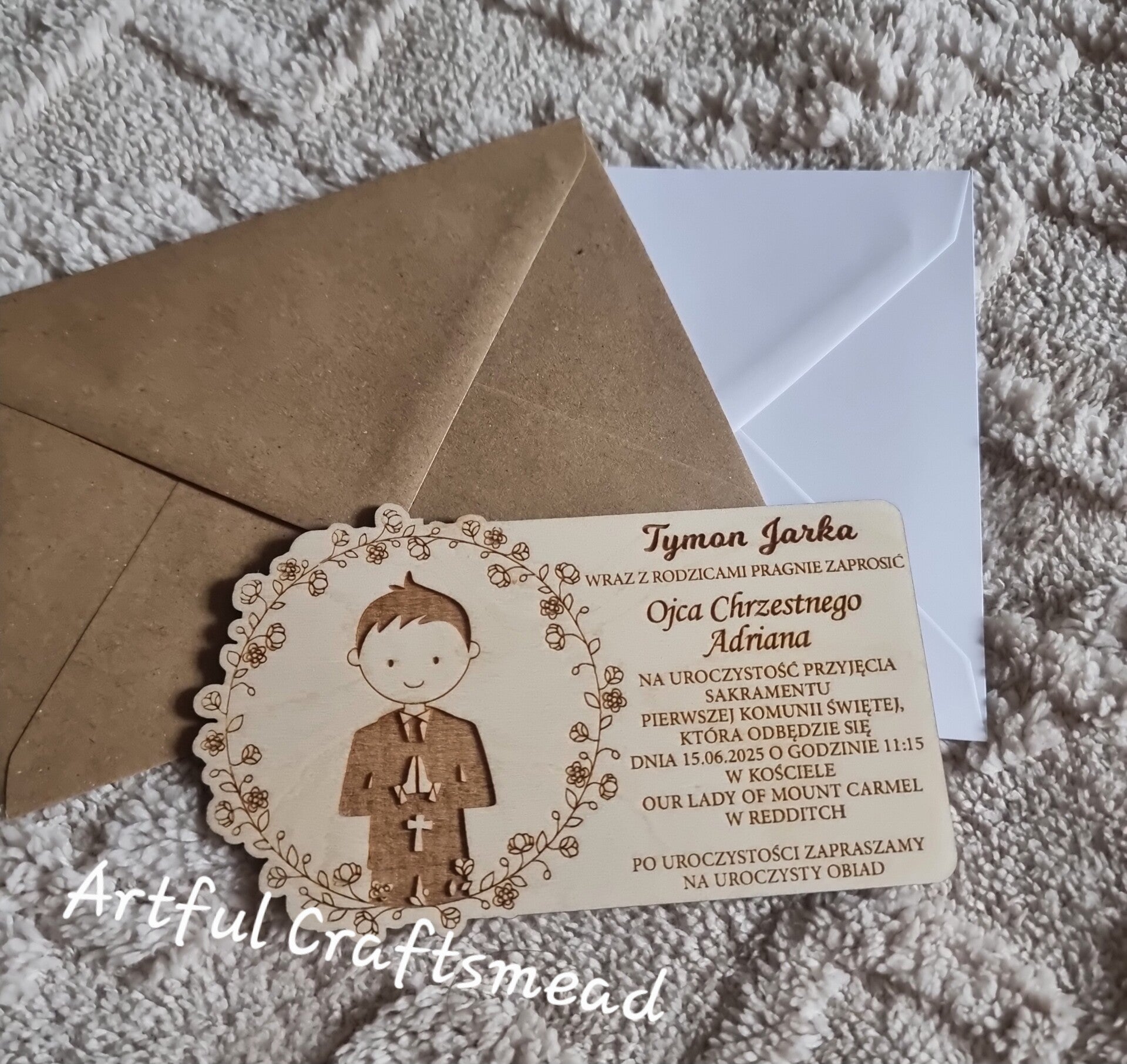 Wykonane z 3 mm sklejki, nasze zaproszenia mają oszałamiającą grafikę chłopca lub dziewczynki, otoczoną pięknym wieńcem kwiatowym. 🌸👦👧