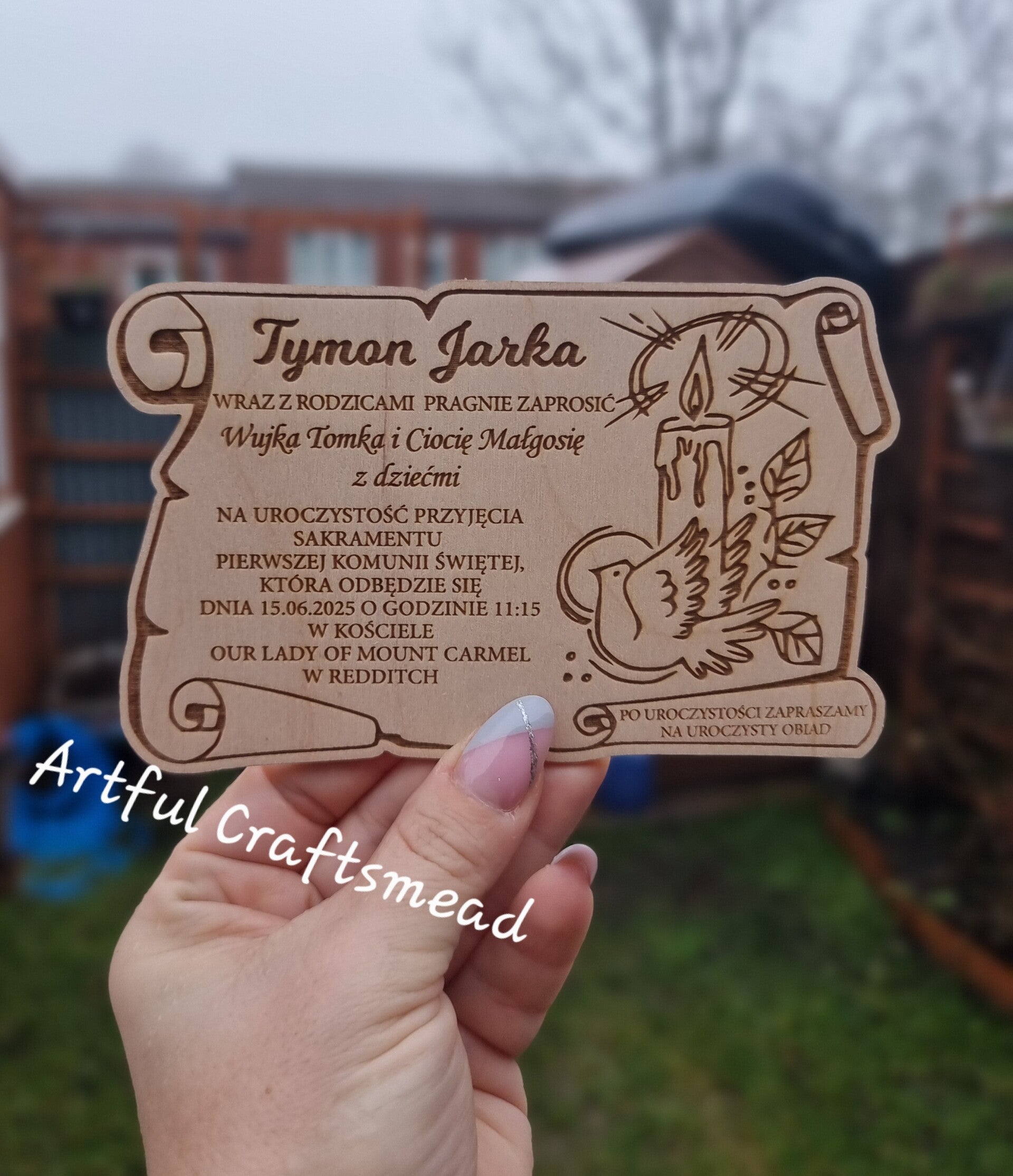 Wykonane z 3 mm sklejki zaproszenia te charakteryzują się pięknym wzorem papieru przypominającego zwój, z płonącą świecą po prawej stronie i szybującym w pobliżu gołębiem. Tekst zaproszenia jest wdzięcznie wyświetlany po lewej stronie. 🌟🕊️