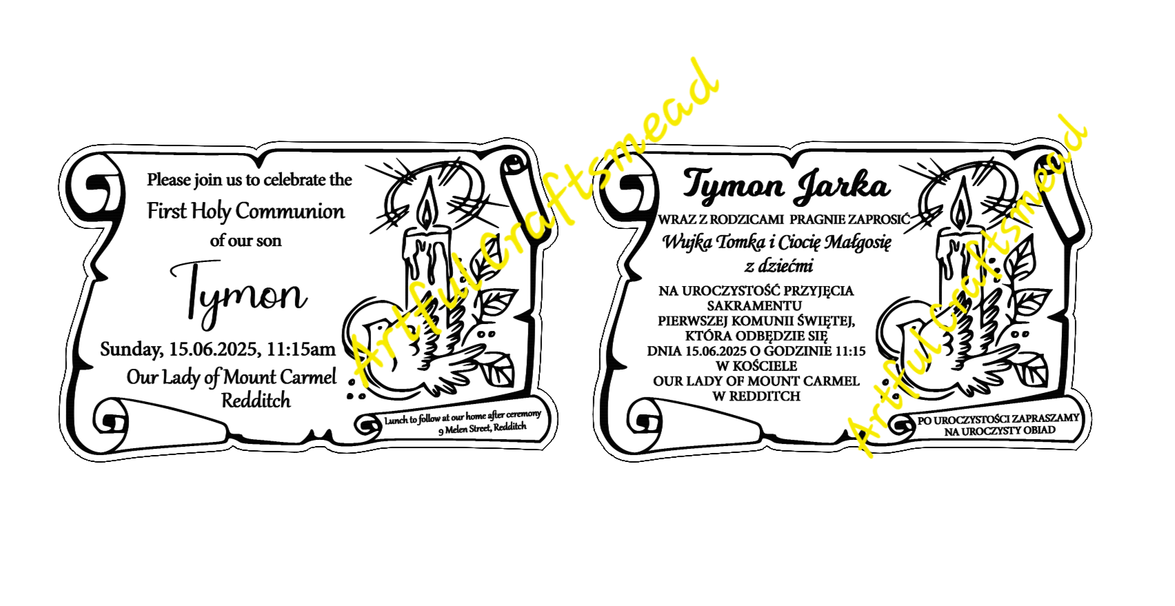 Crafted from 3mm thick plywood, these invitations feature a beautiful design of scroll-like paper, with a candle burning on the right side and a dove soaring nearby. The text of the invitation is gracefully displayed on the left side. 🌟🕊️
