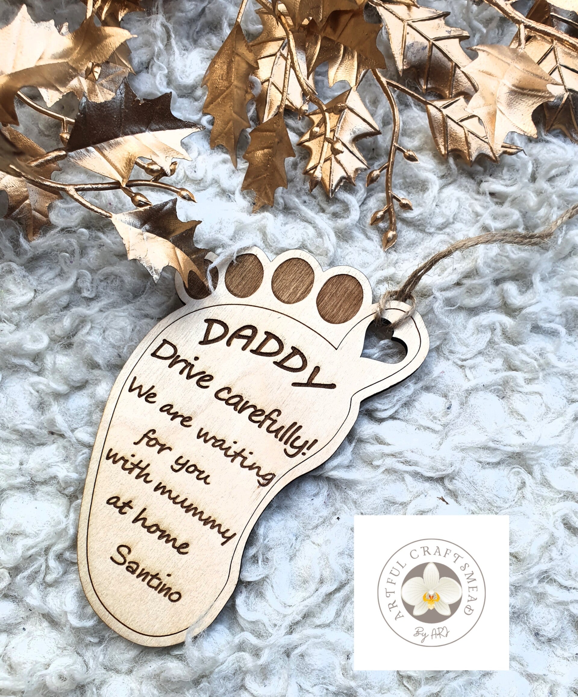 Custom Wooden Baby Foot Ornament: "Drive Safely, We're Waiting at Home!" 🌟