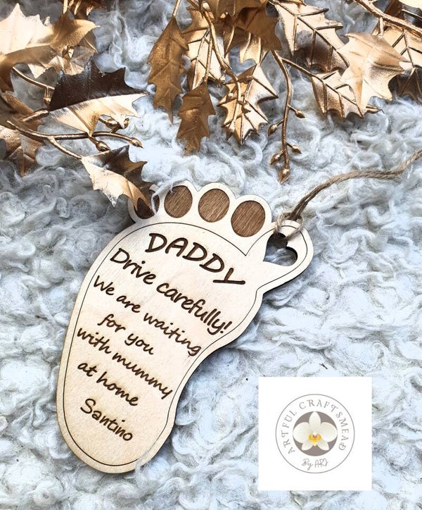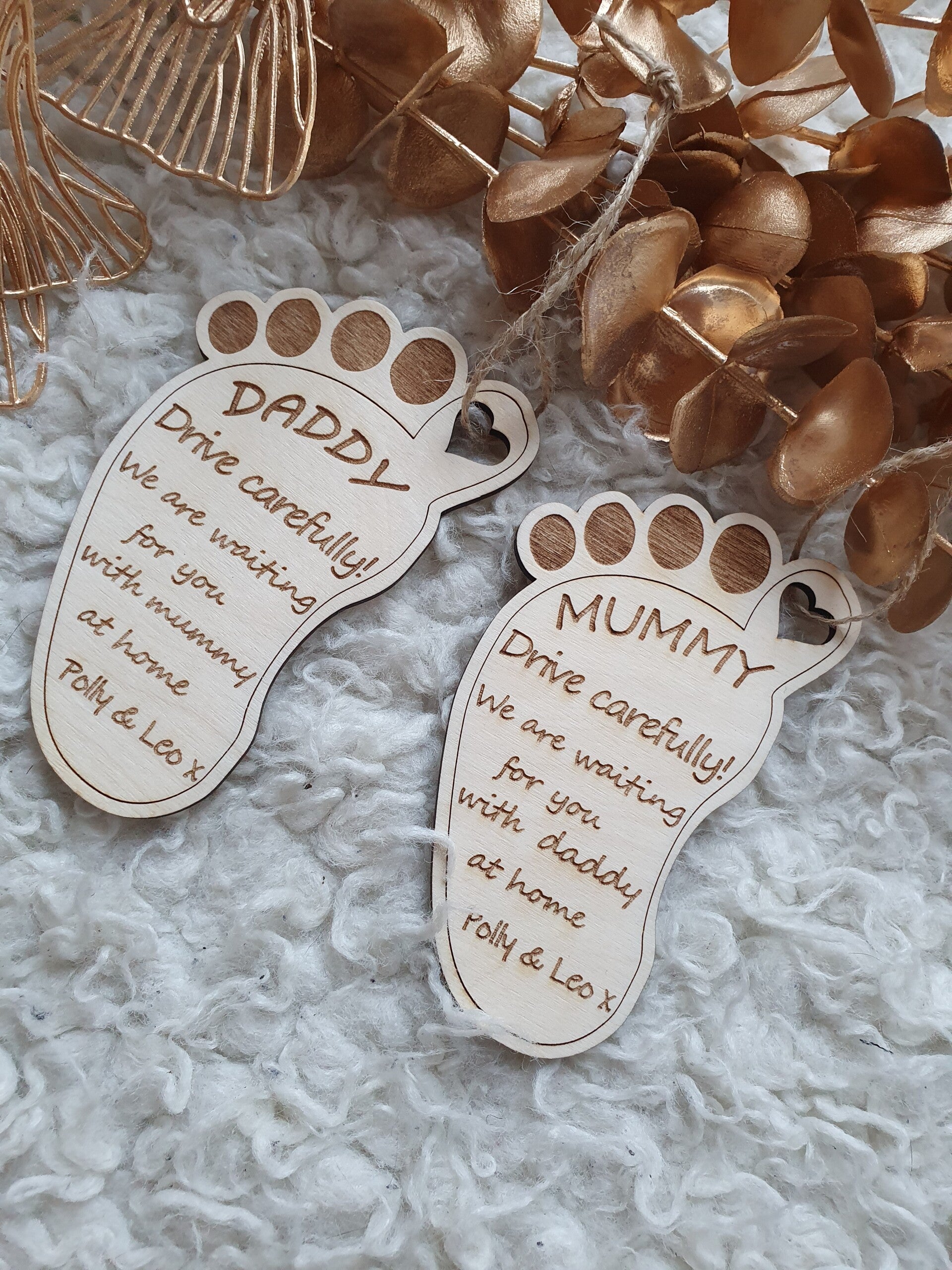 Custom Wooden Baby Foot Ornament: "Drive Safely, We're Waiting at Home!" 🌟Niestandardowa drewniana ozdoba w kształcie stóp dziecka: „Jedź bezpiecznie, czekamy w domu!”