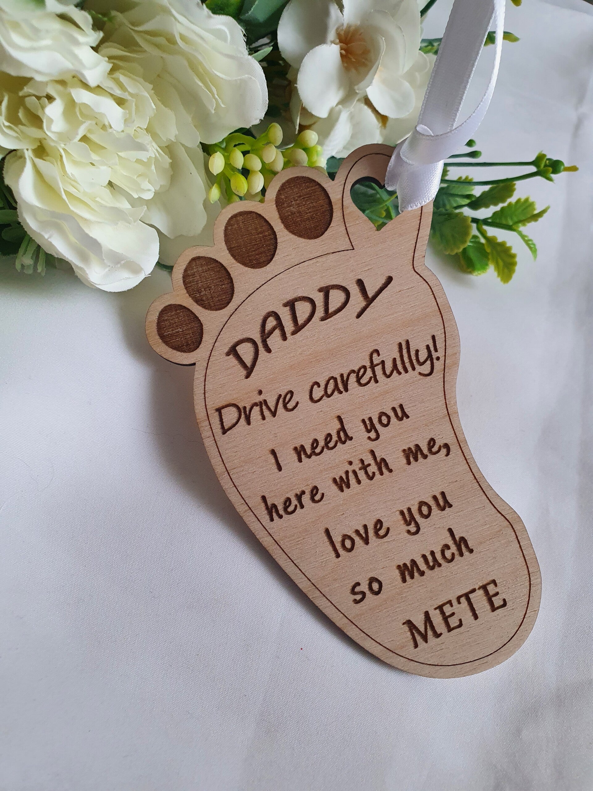 Niestandardowa drewniana ozdoba w kształcie stóp dziecka: „Jedź bezpiecznie, czekamy w domu!” 🌟