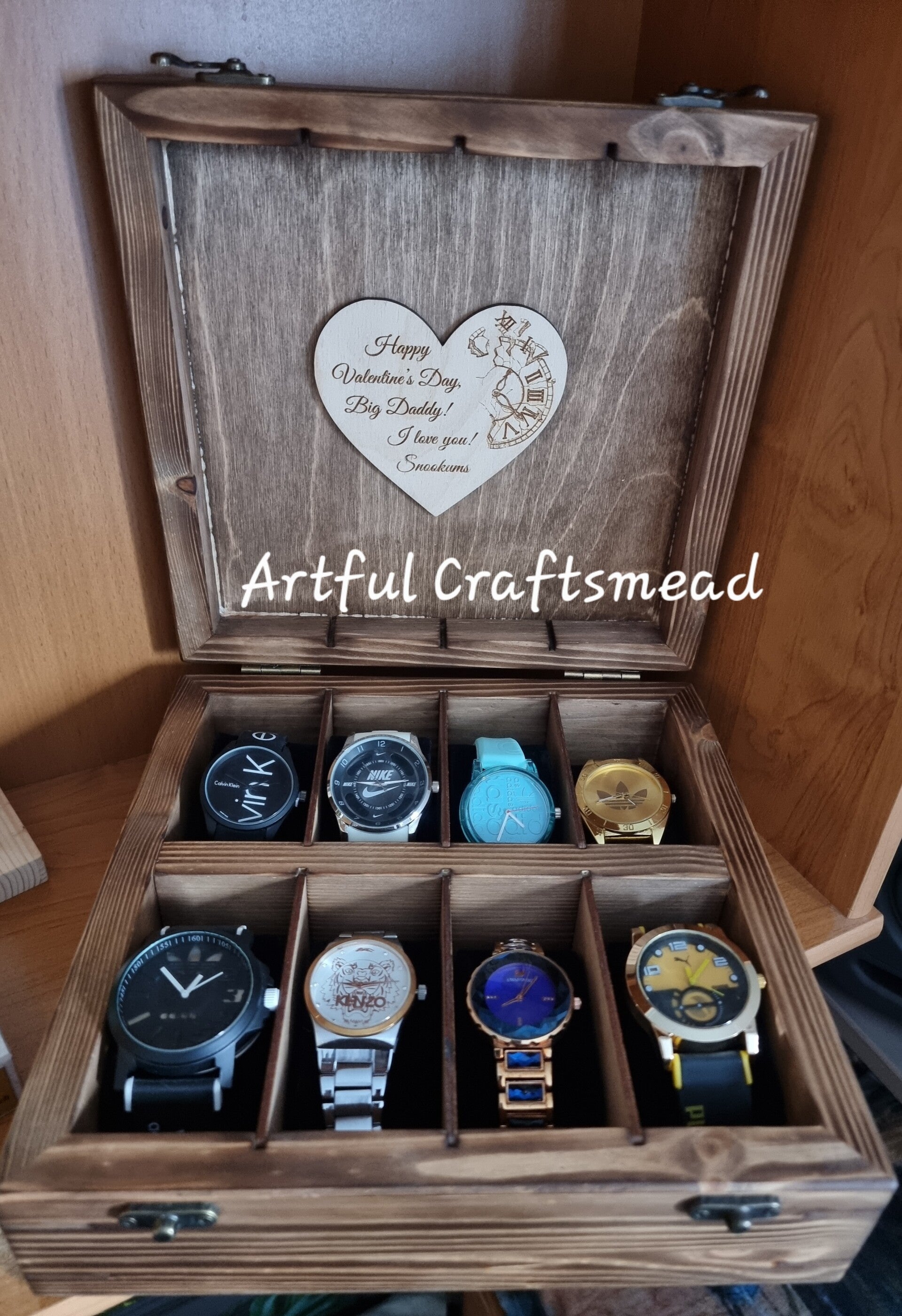 Personalised Handcrafted Pine Wood Watch Box, Wooden Box For 8 watches, Cushion free, Custom With Name and message/ Personalizowane ręcznie robione pudełko na zegarki z drewna sosnowego, drewniane pudełko na 8 zegarków, spersonalizowane z im