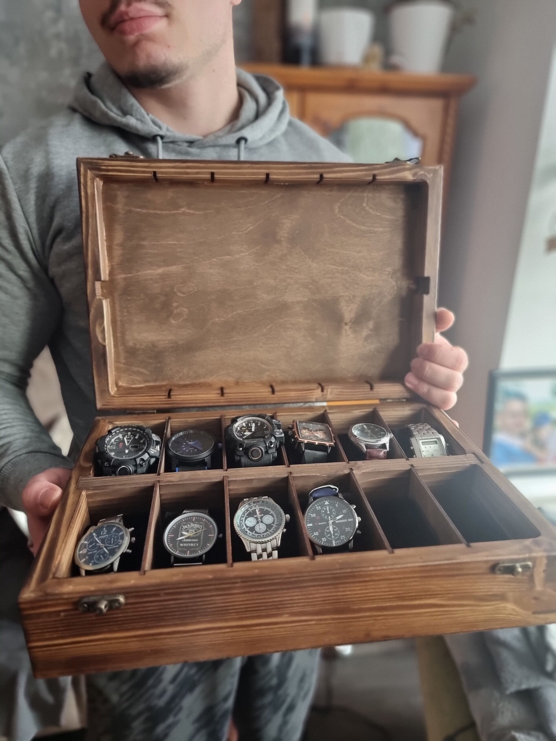 Spersonalizowane, niestandardowe pudełko na zegarki z 12 przegródkami
