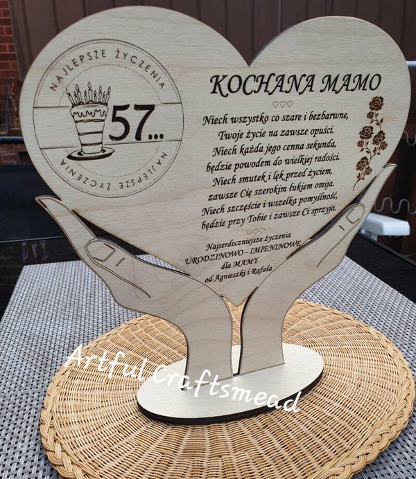 Personalised Wooden Heart Stand with Poem – Birthday or Name Day Gift for Mum, Drewniana dekoracja serce z życzeniami – personalizowany prezent urodzinowy/imieninowy dla mamy