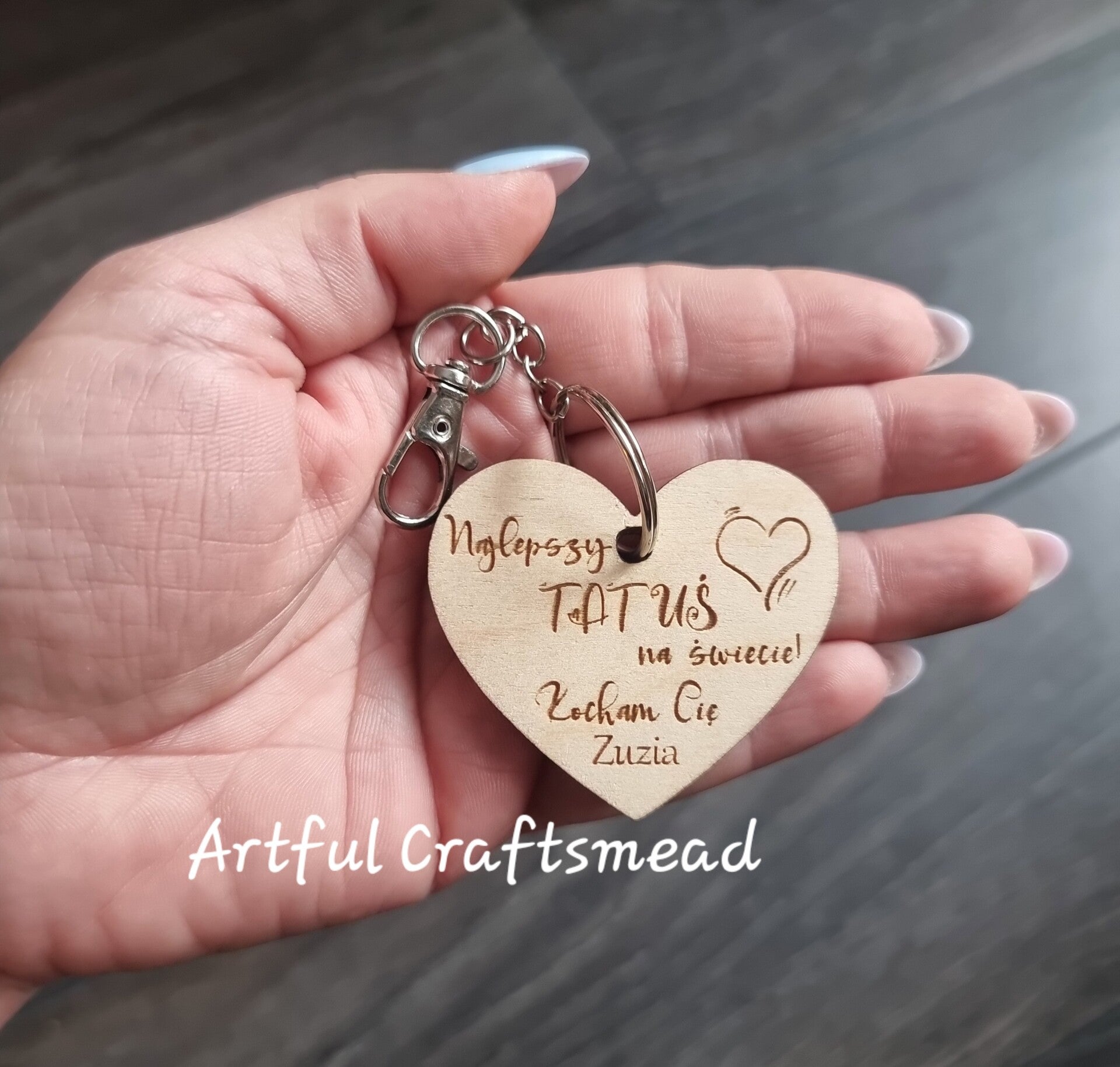 Słowa kluczowe: breloczek dla taty, prezent na dzień ojca, drewniany breloczek serce, personalizowany brelok, prezent od dziecka, kocham cię tato