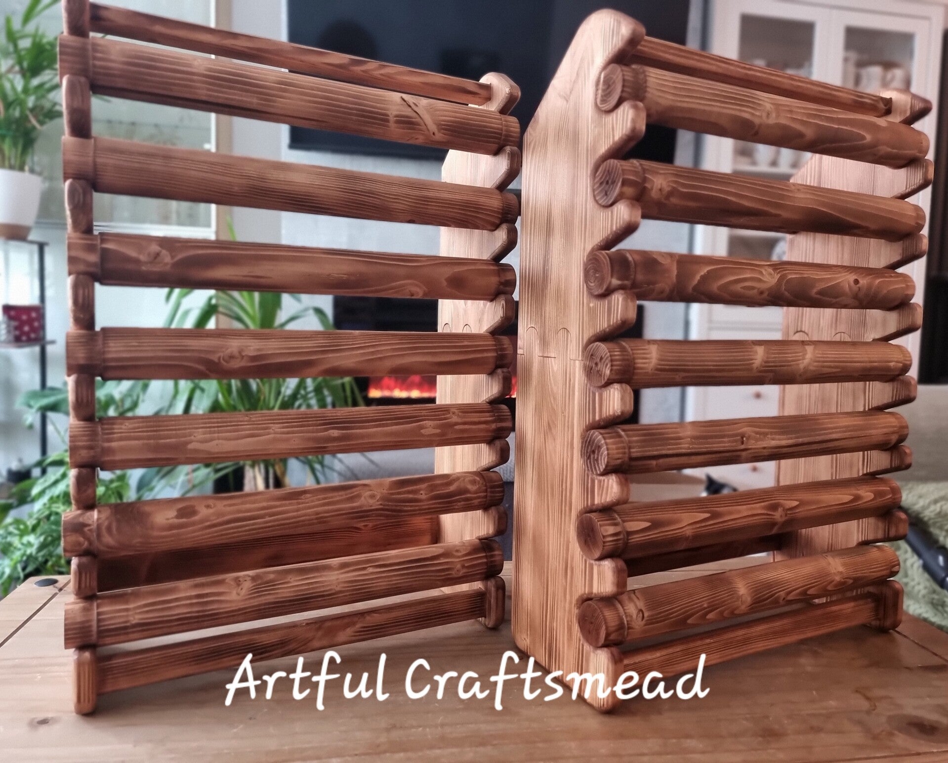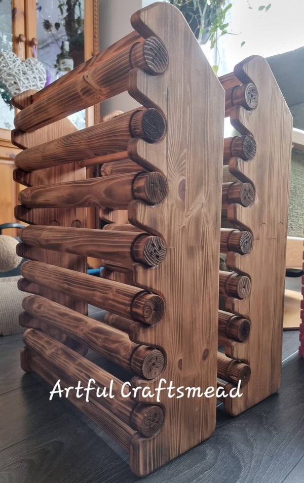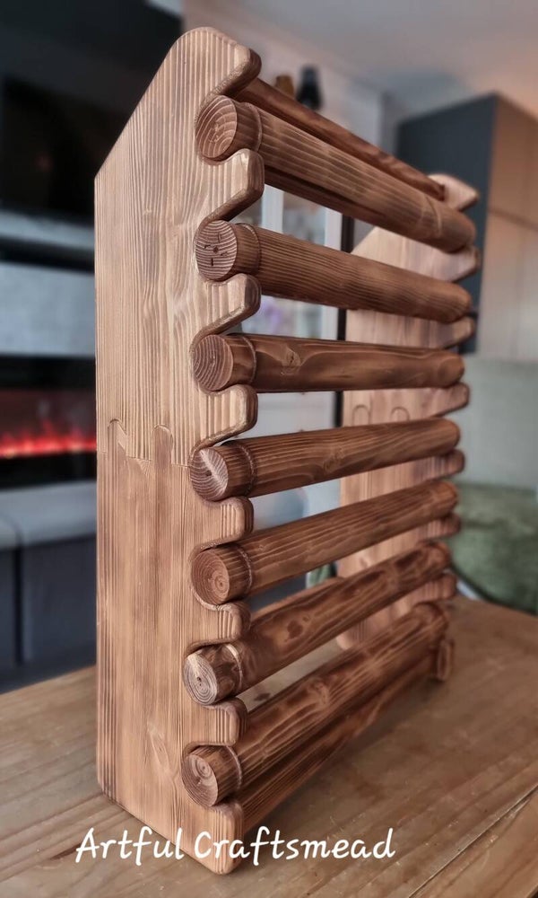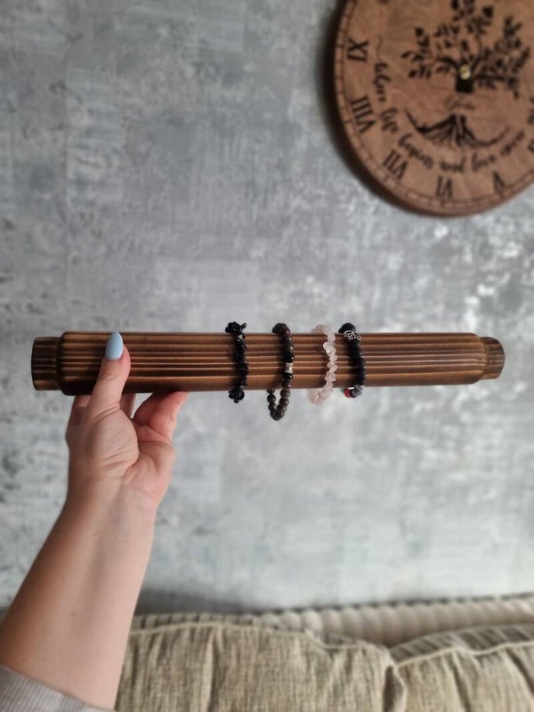 This stunning wooden bracelet display stand is the perfect organizer for your handmade jewelry collection. With a solid pine wood build, beautifully torched and stained, it’s not only functional but adds rustic charm to any room or studio! 💫