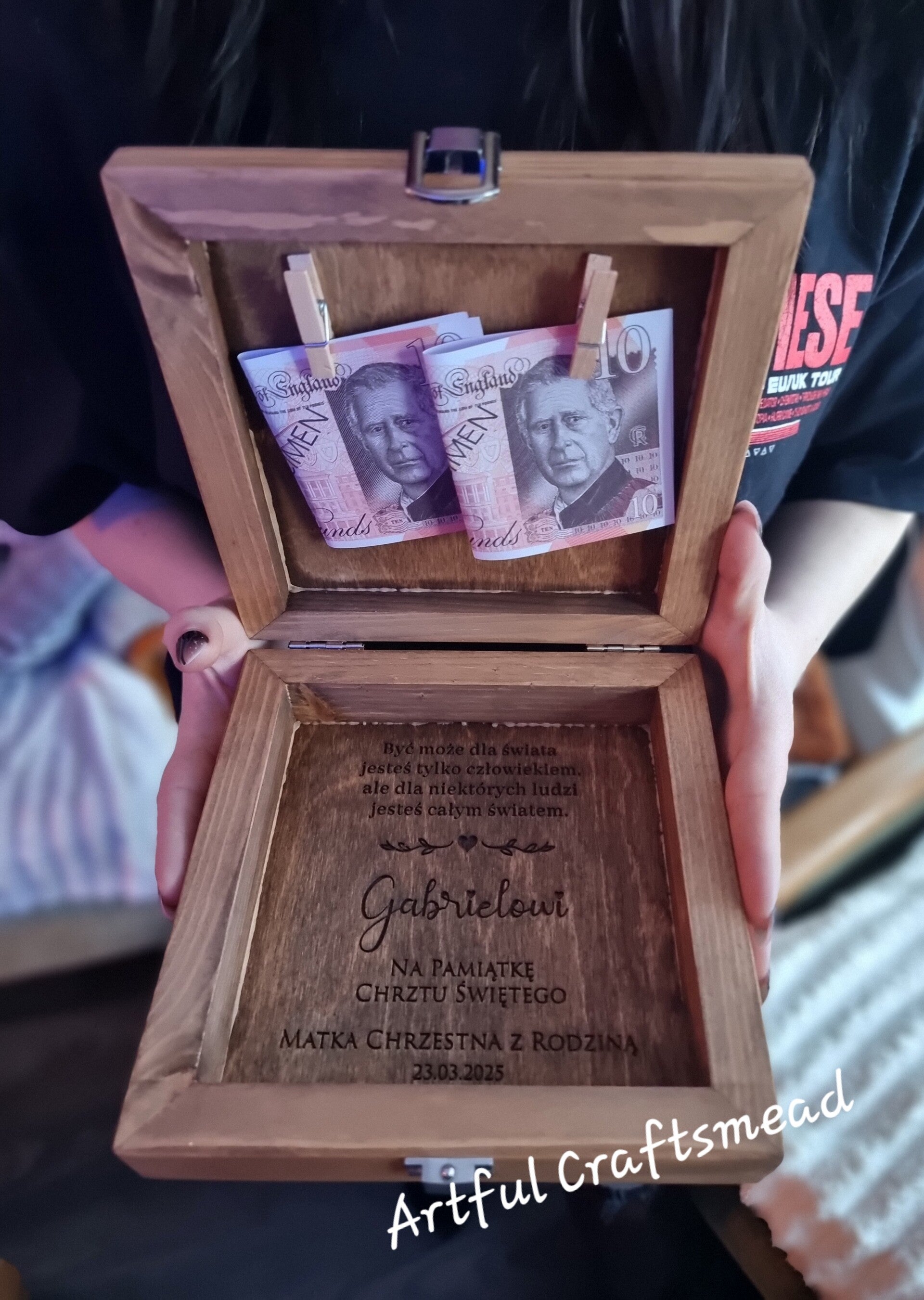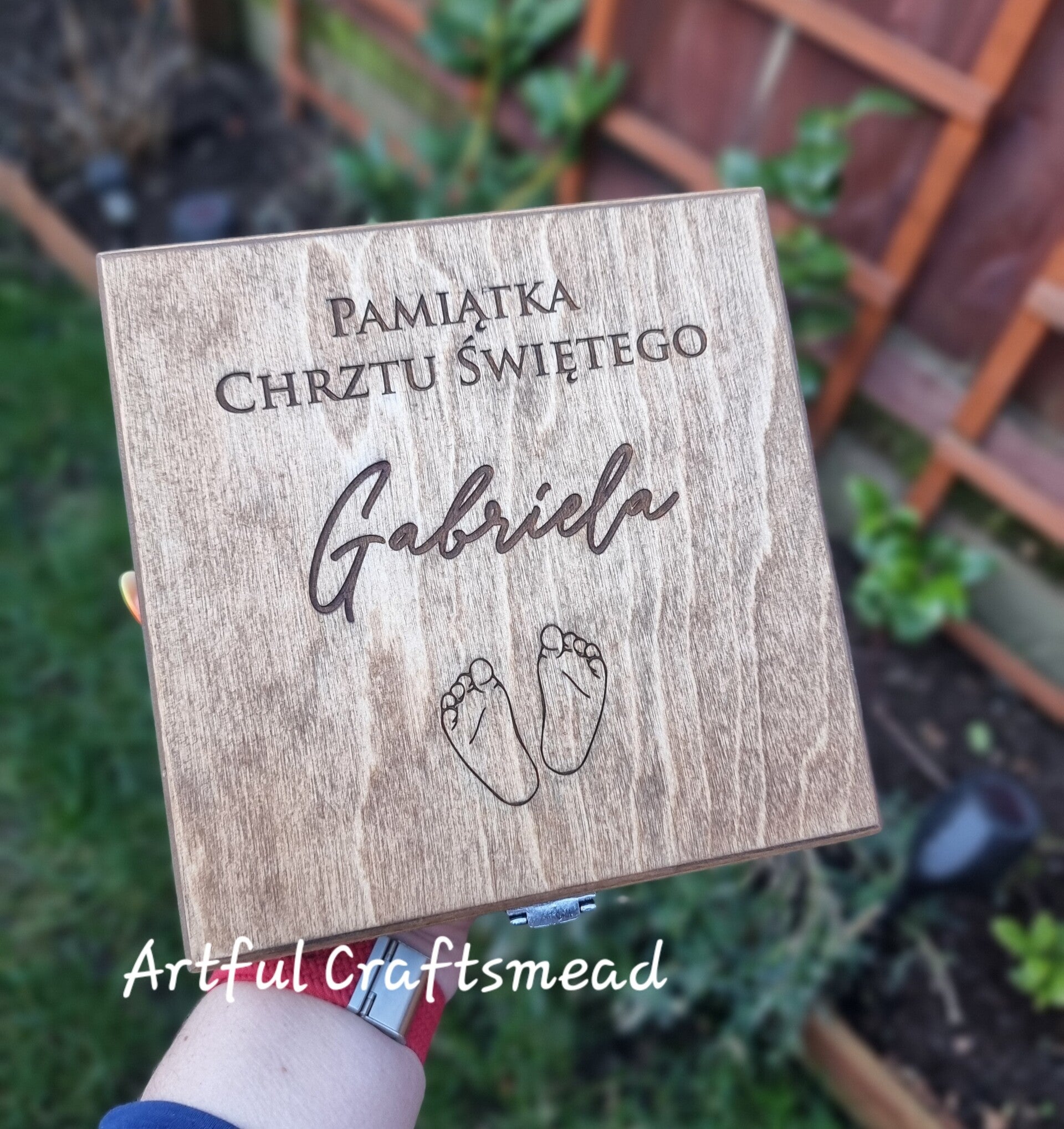 Each box is crafted from solid pine wood, beautifully stained and engraved with your custom details. On the lid, we engrave the phrase "PamiΔ tka Chrztu ΕwiΔtego" "On your Baptism" (or your own custom text), along with the child's name and a sweet footprint design π£. Inside, there's space for your personalized message, and two mini wooden pegs to hold a photo, money, a small note, or anything meaningful π.