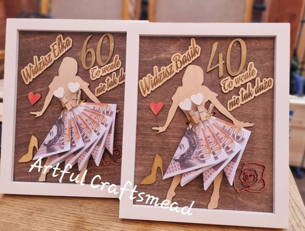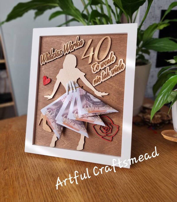 ๐ Wooden silhouette holds real folded banknotes as a “skirt”