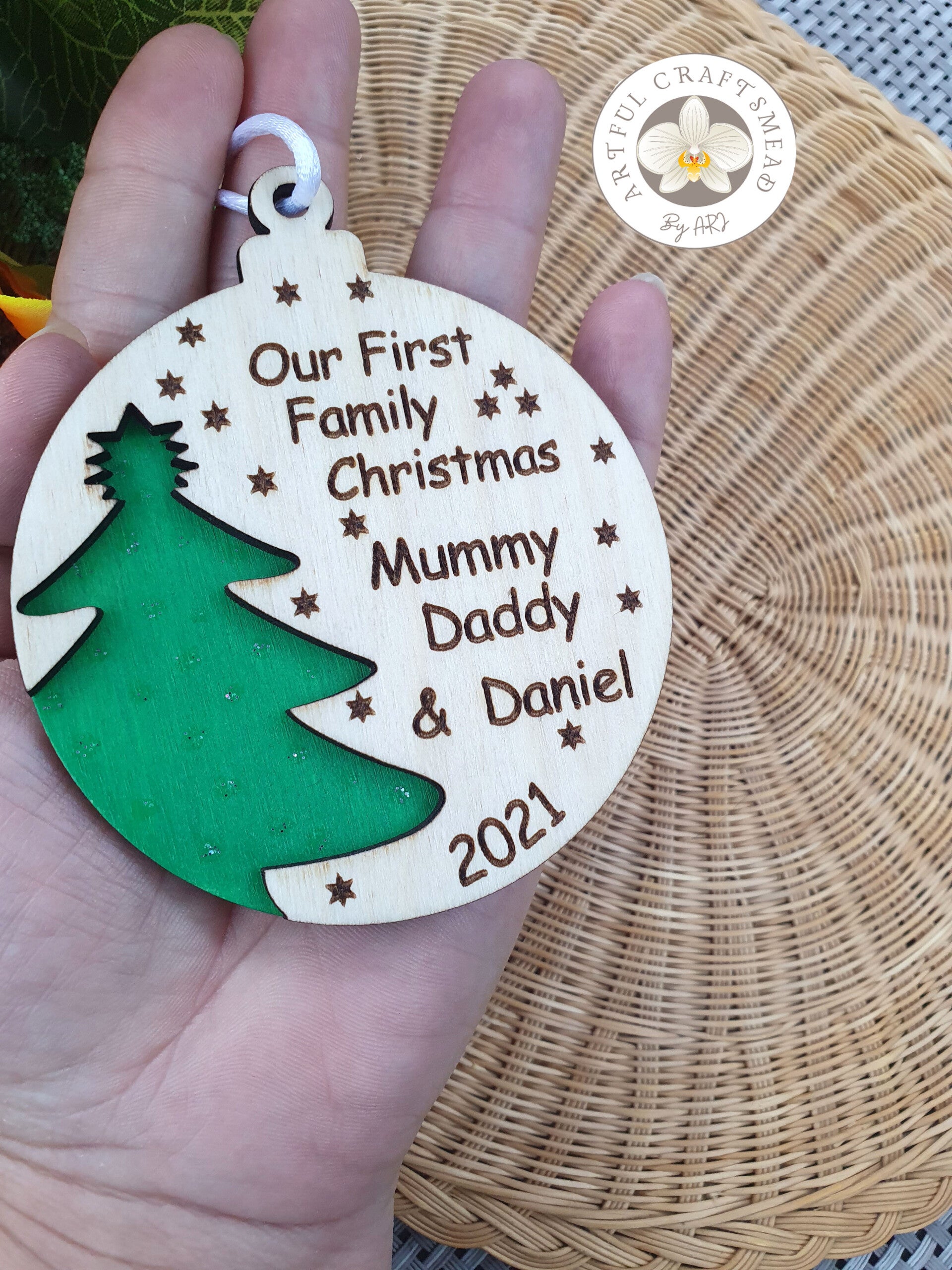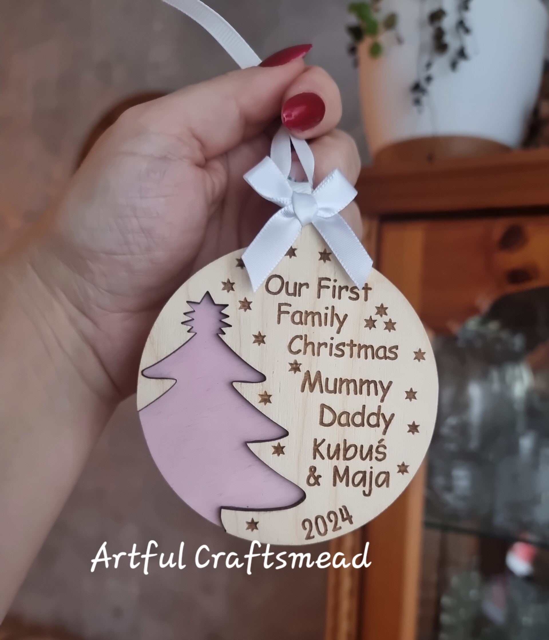 Personalised Wooden Family Christmas Ornament β Custom Name Bauble β Pink or Green Tree β First Christmas Keepsake β Holiday Gift Decor