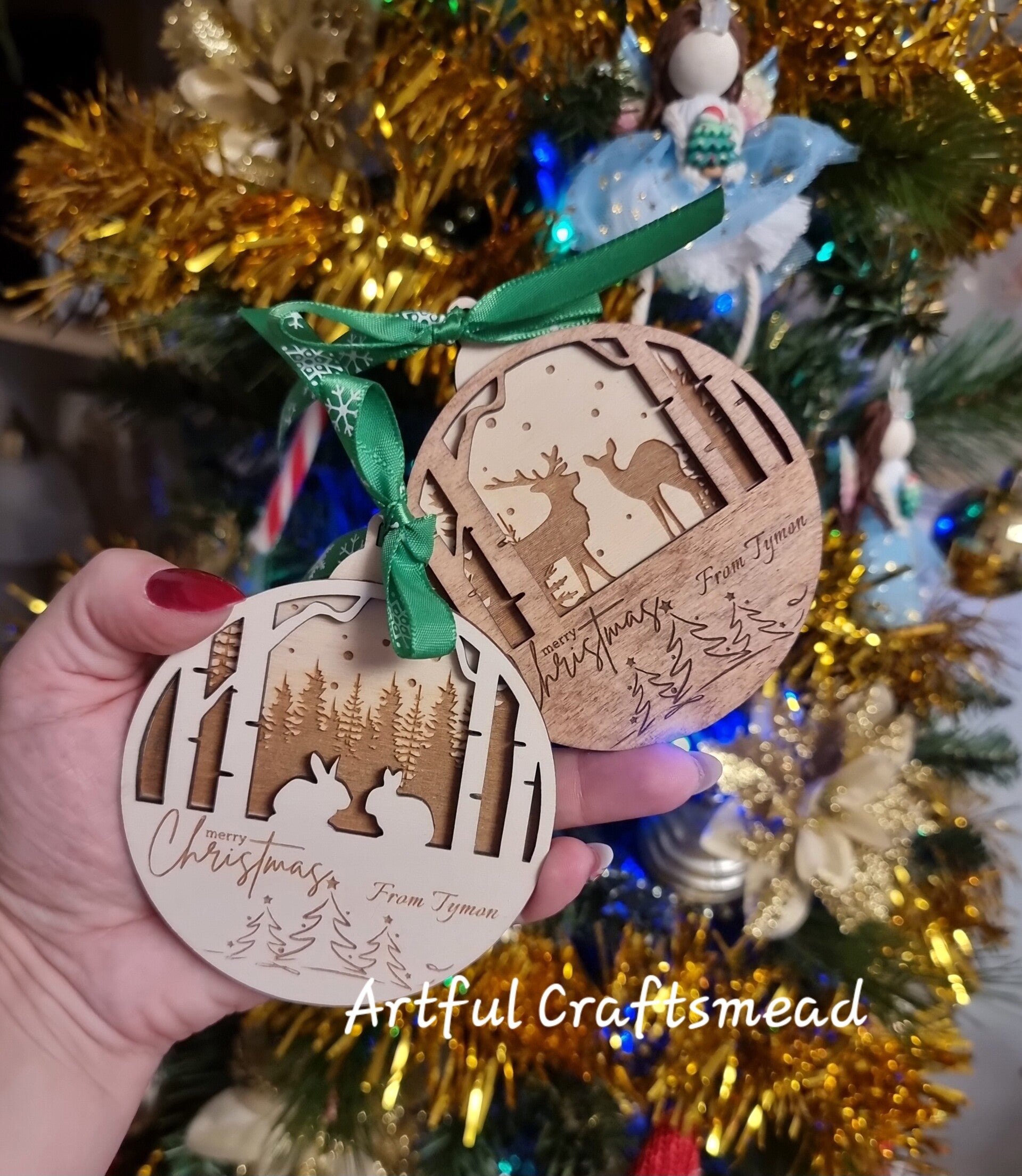 Personalised Wooden Christmas Ornament β Forest Scene Bauble with Custom Message β Two Designs β Rustic Layered Tree Decoration