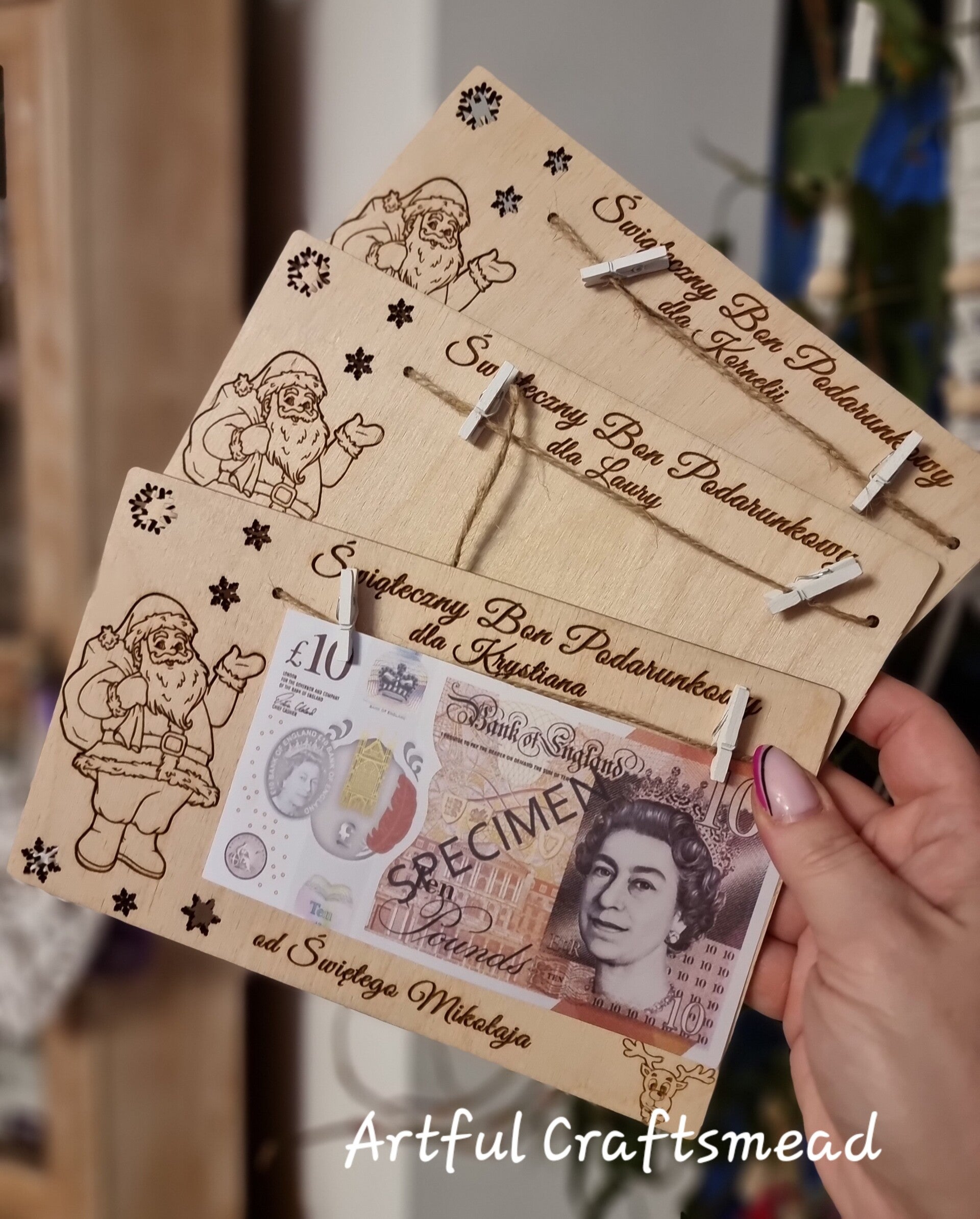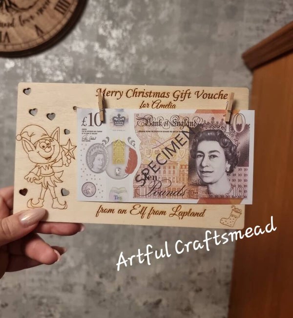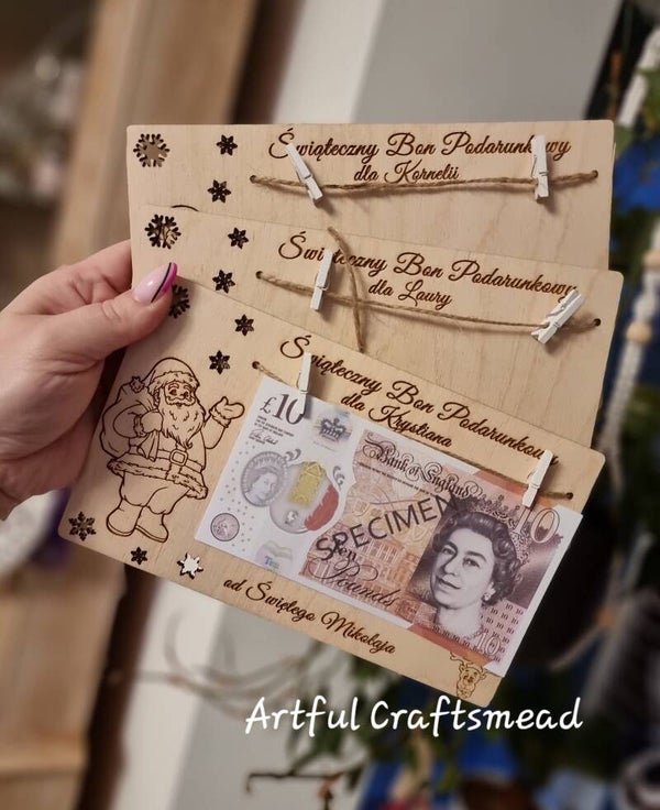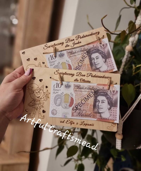 Instead of handing out cash in a boring envelope – surprise your little one with this fun and festive wooden gift voucher holder, personalised with their name! 🎁🎅