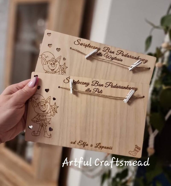 This charming laser-engraved card is a creative way to give money for Christmas, St. Nicholas Day or any holiday surprise. Choose from two designs – Santa Claus or a cheerful Elf from Lapland – and select your preferred language (English or Polish).