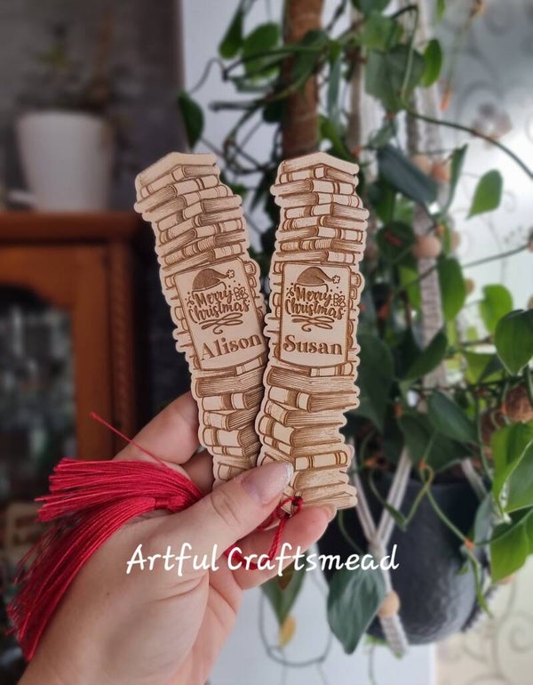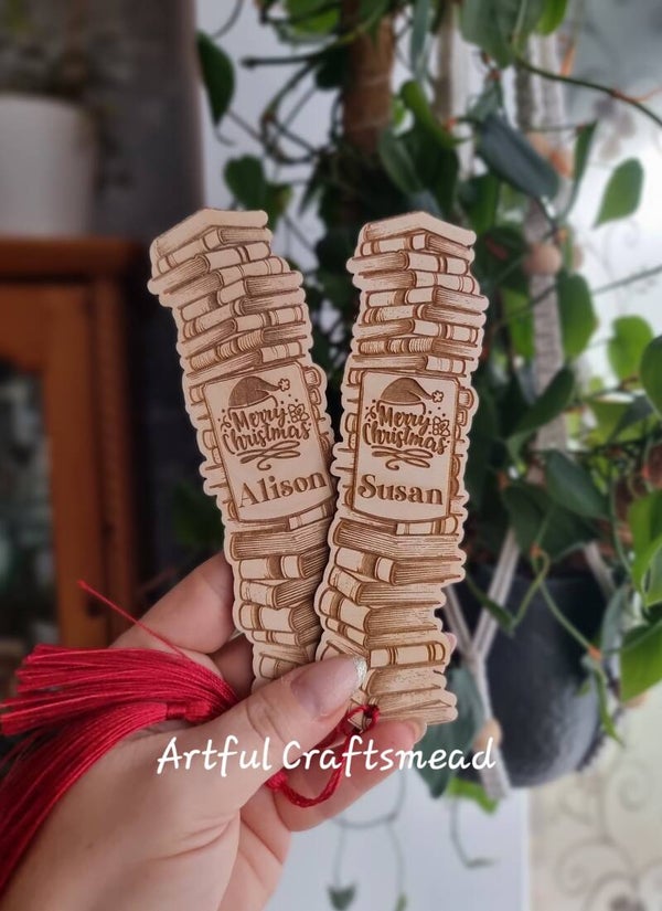 Personalised Wooden Christmas Bookmark – Book Stack Design with Name – Red or Green Tassel – Reader Gift