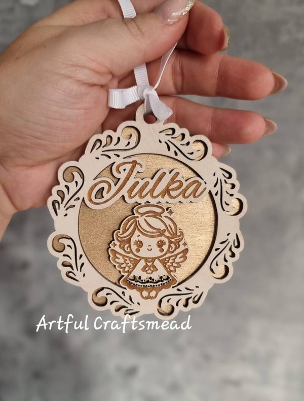 custom Christmas ornament, wooden angel bauble, personalised tree decoration, holiday name gift, baby’s first Christmas, wooden hanging ornament, rustic festive decor