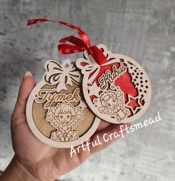 Personalised Angel Christmas Bauble – Custom Wooden Ornament – 2 Designs, 2 Colours