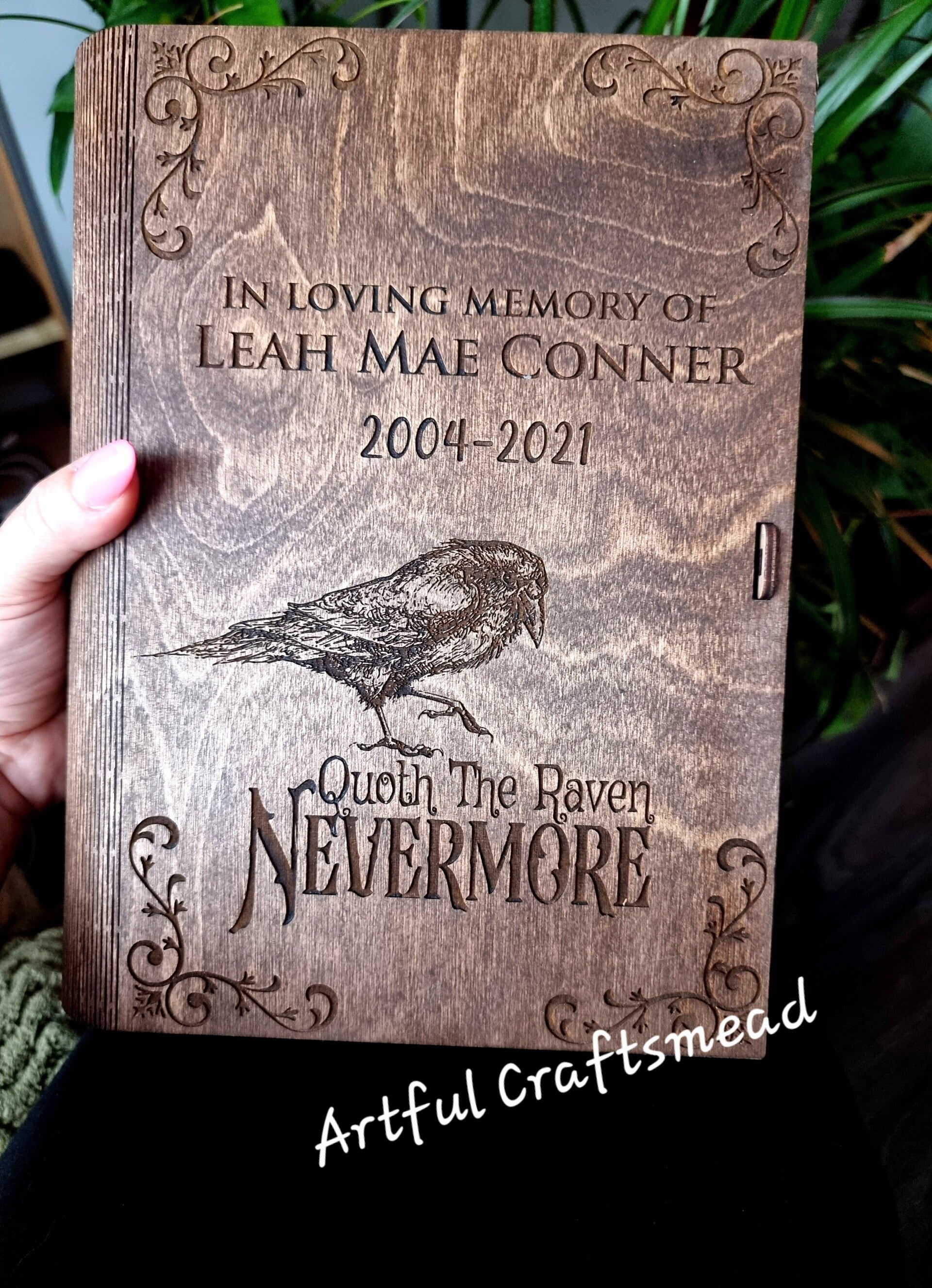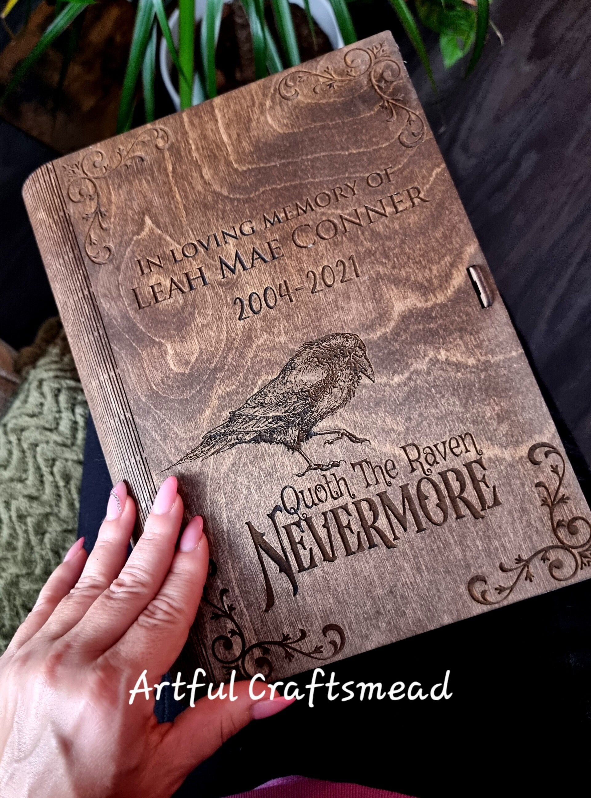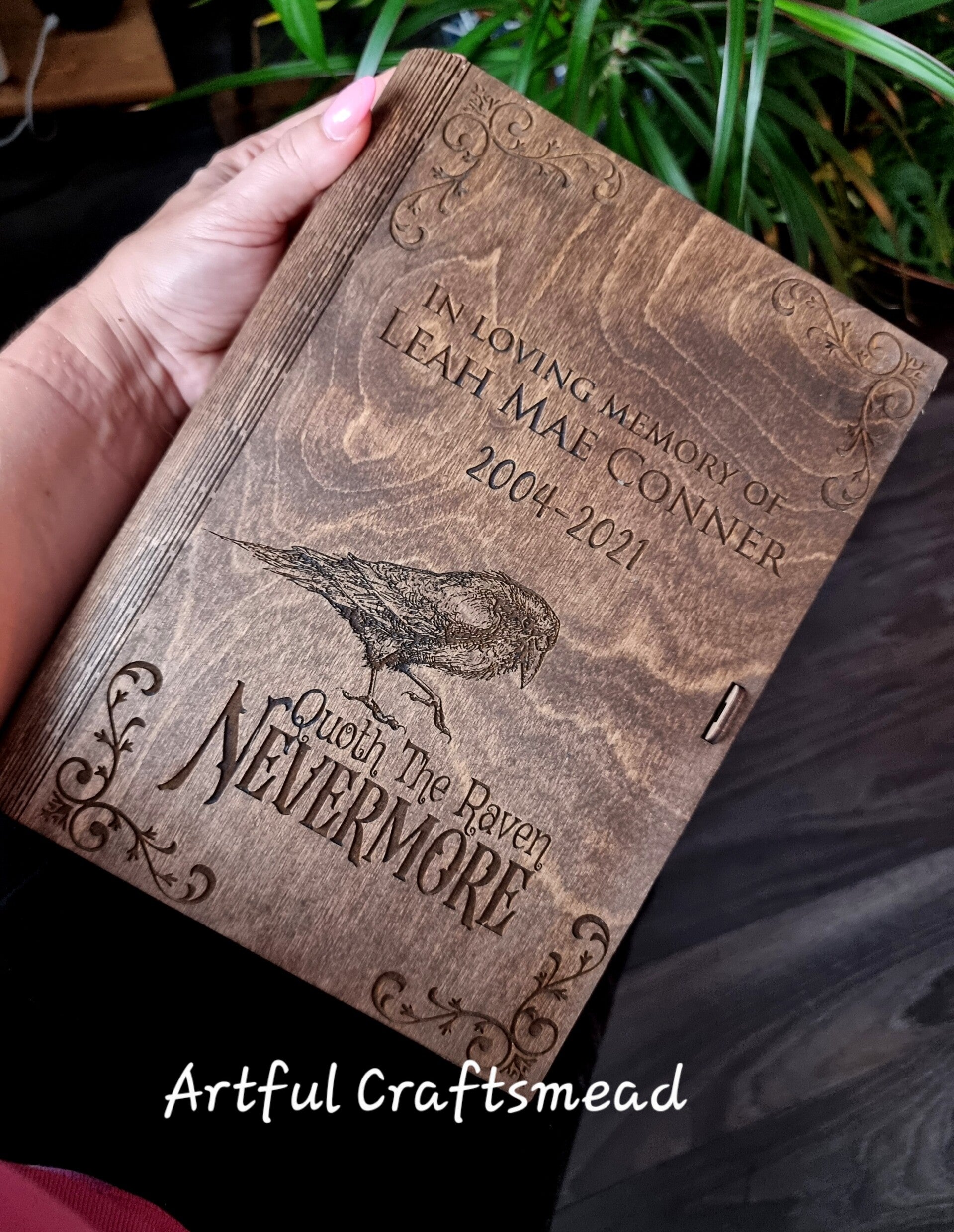 A truly unique wooden box disguised as a book – ideal for holding your memories, letters, trinkets or treasures. Thoughtfully engraved with a beautifully detailed raven and the iconic quote “Quoth the Raven, Nevermore”, this keepsake box can be personalised with any name, date or quote to suit your story. 🕯️🖋️