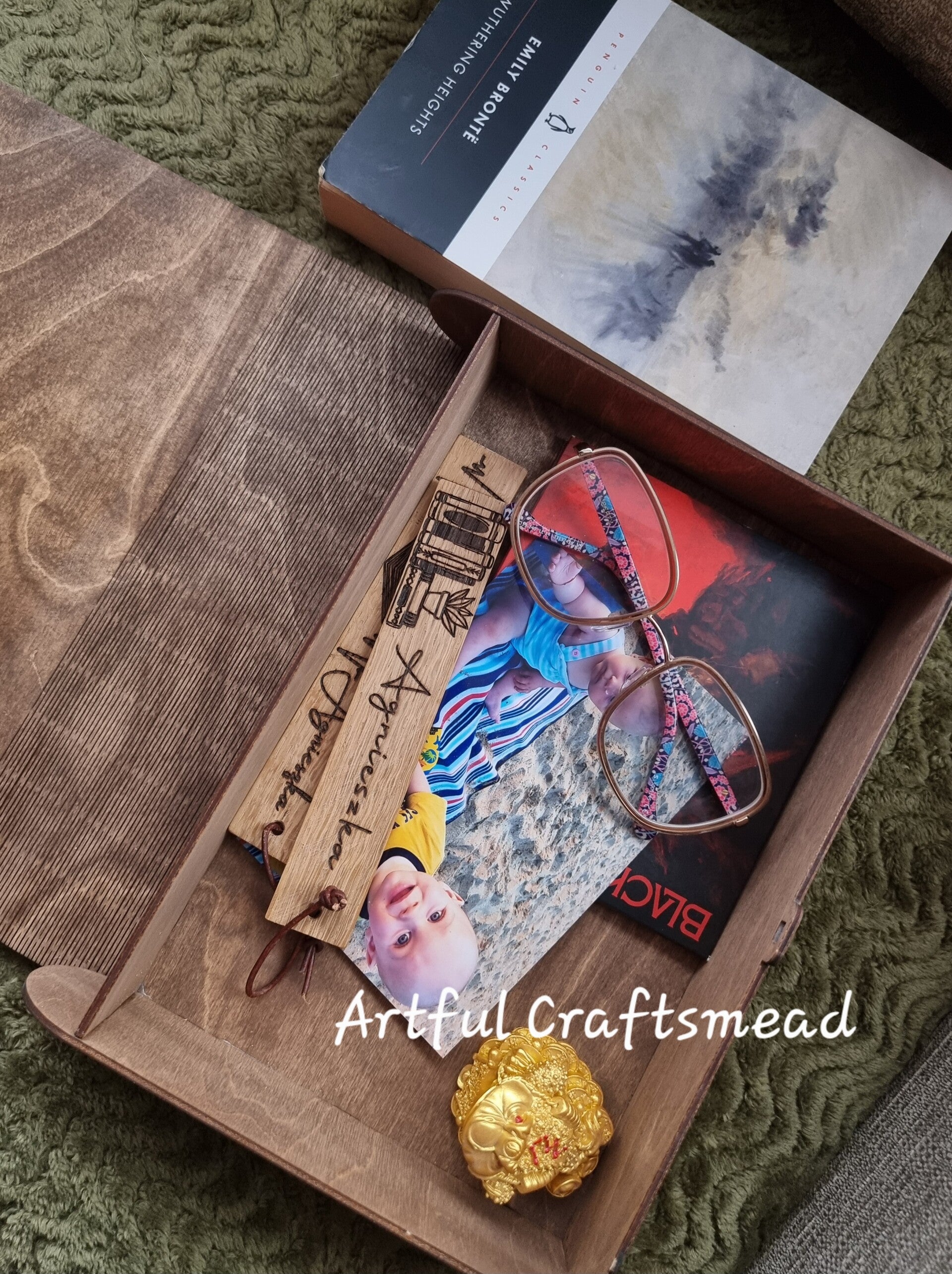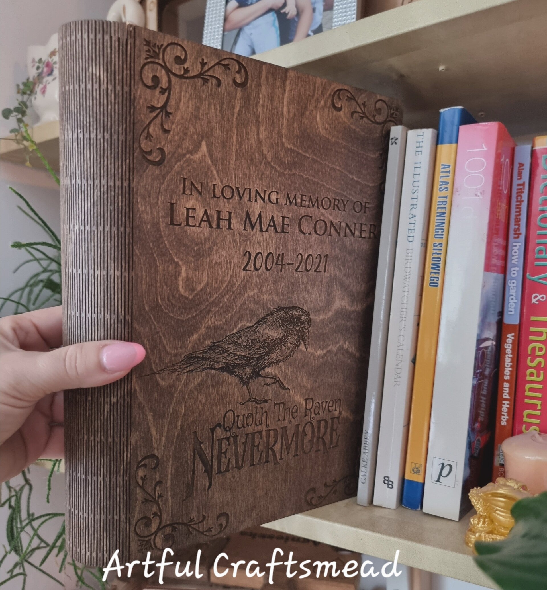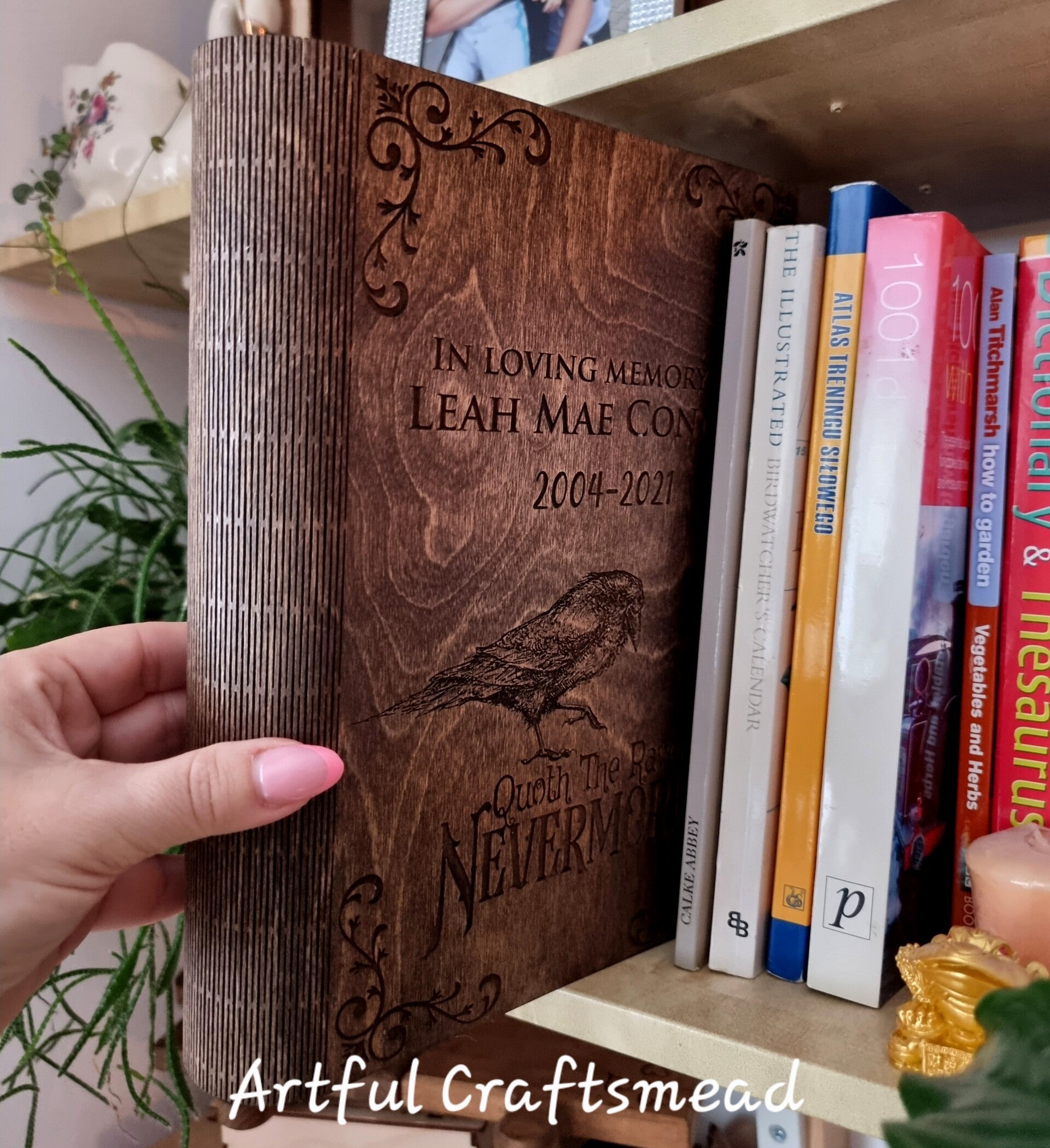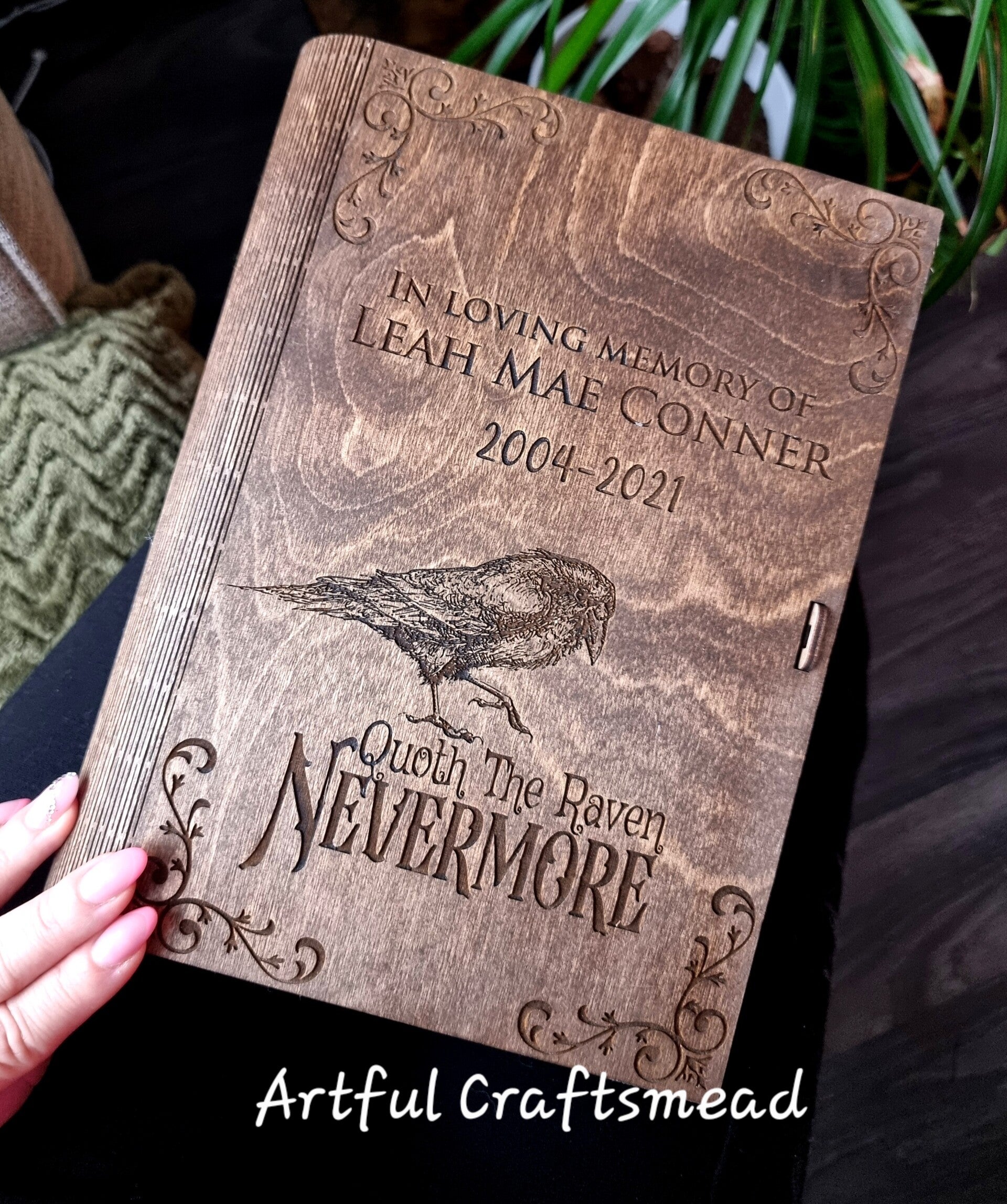 A truly unique wooden box disguised as a book – ideal for holding your memories, letters, trinkets or treasures. Thoughtfully engraved with a beautifully detailed raven and the iconic quote “Quoth the Raven, Nevermore”, this keepsake box can be personalised with any name, date or quote to suit your story. 🕯️🖋️