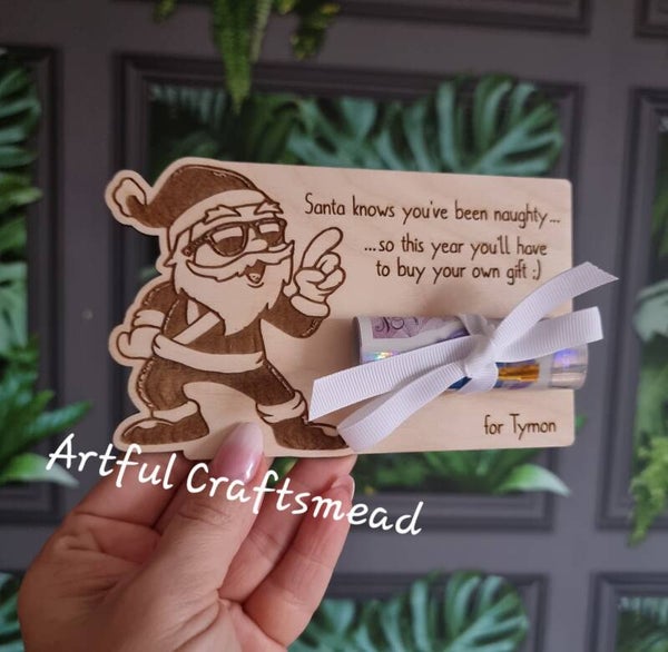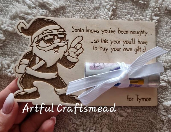 Funny Personalised Santa Money Gift Holder – Naughty Christmas Card Alternative – Wooden Voucher Tag – English or Polish Text
