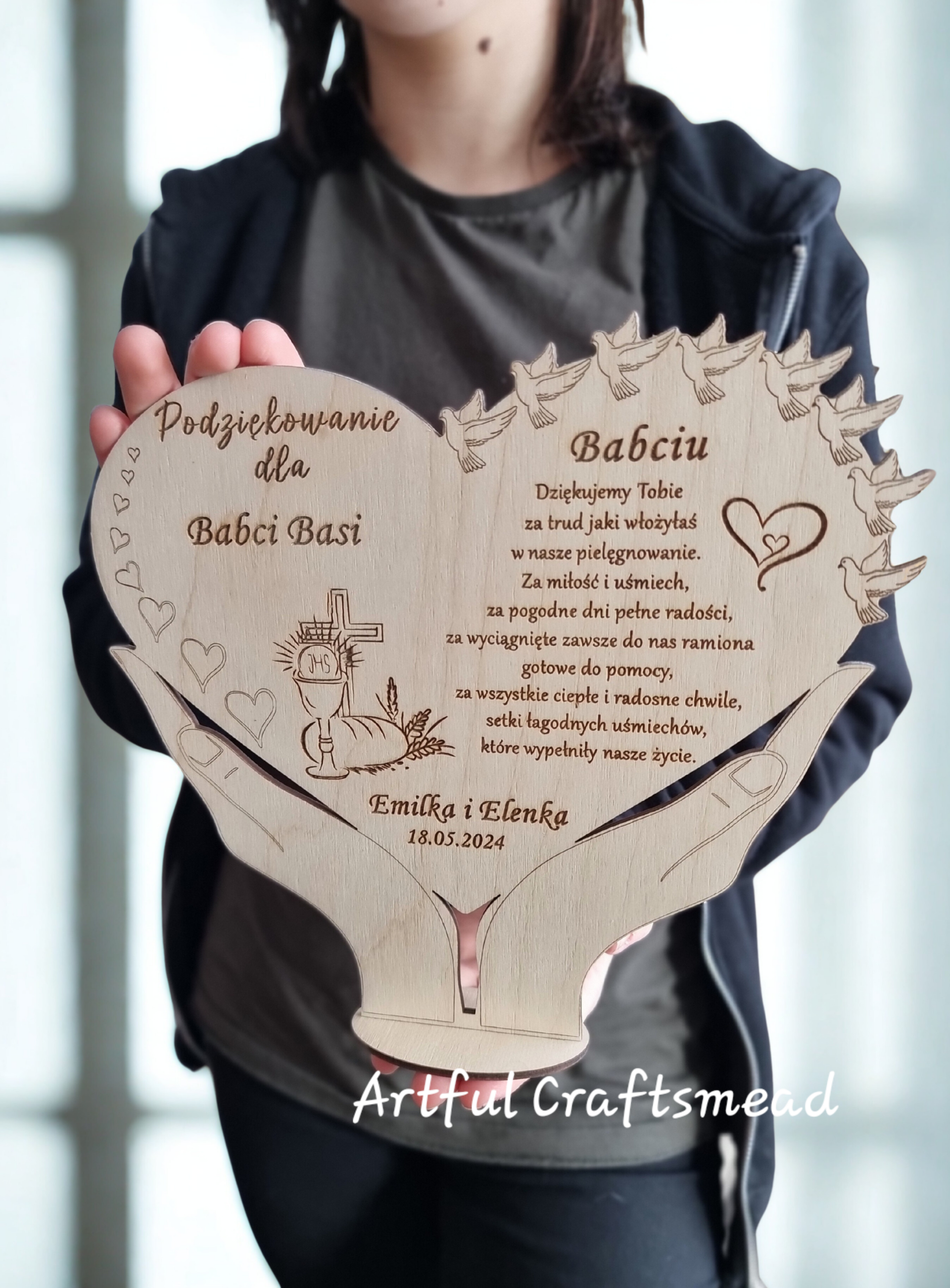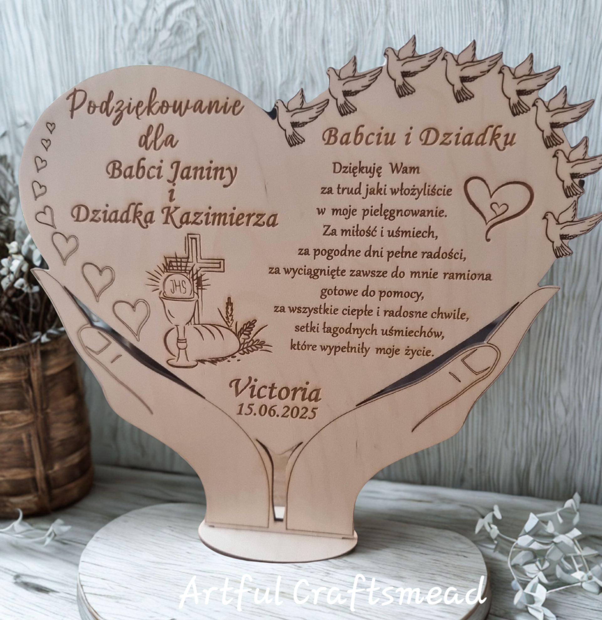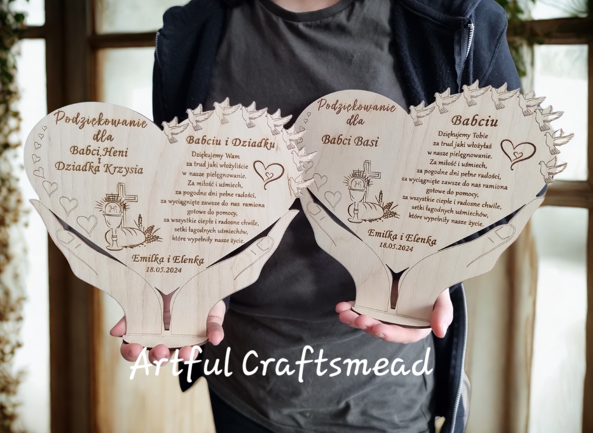 Personalised Wooden Heart in Hands | Communion Thank You Gift for Godparents or Grandparents | Handmade Keepsake