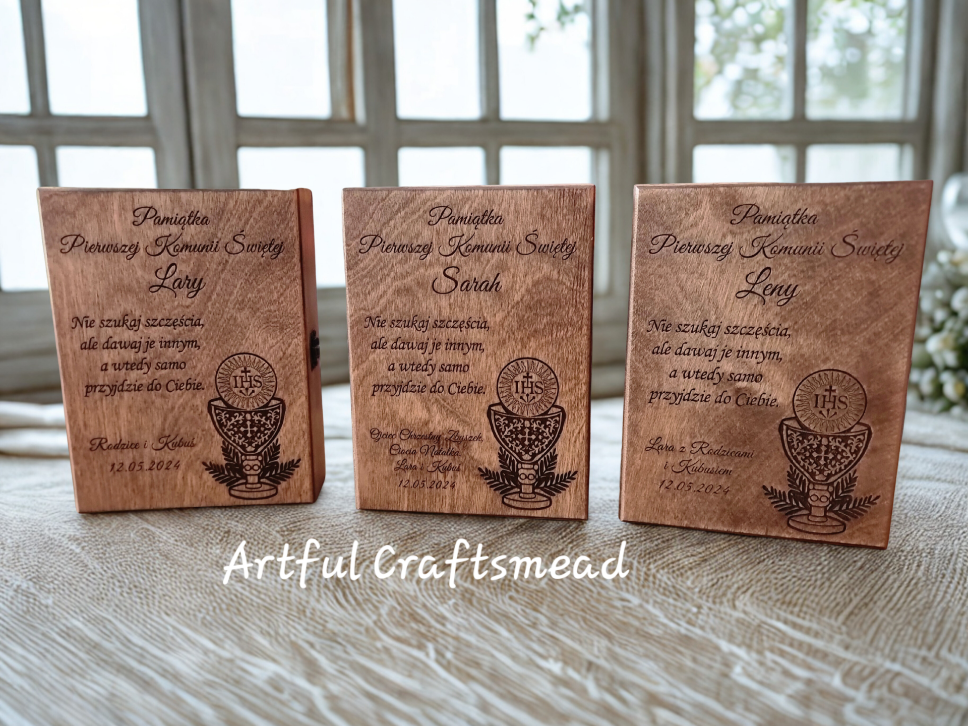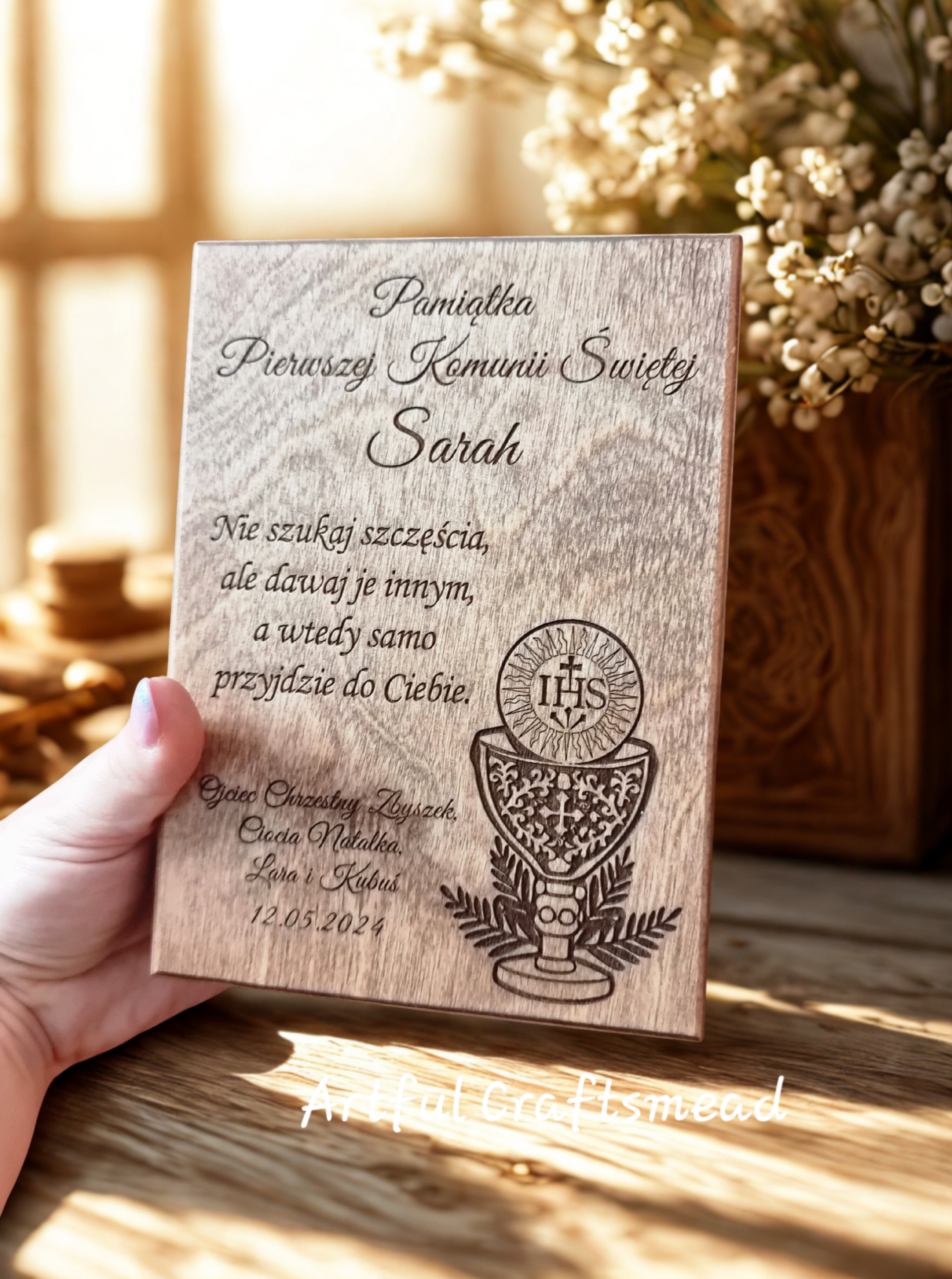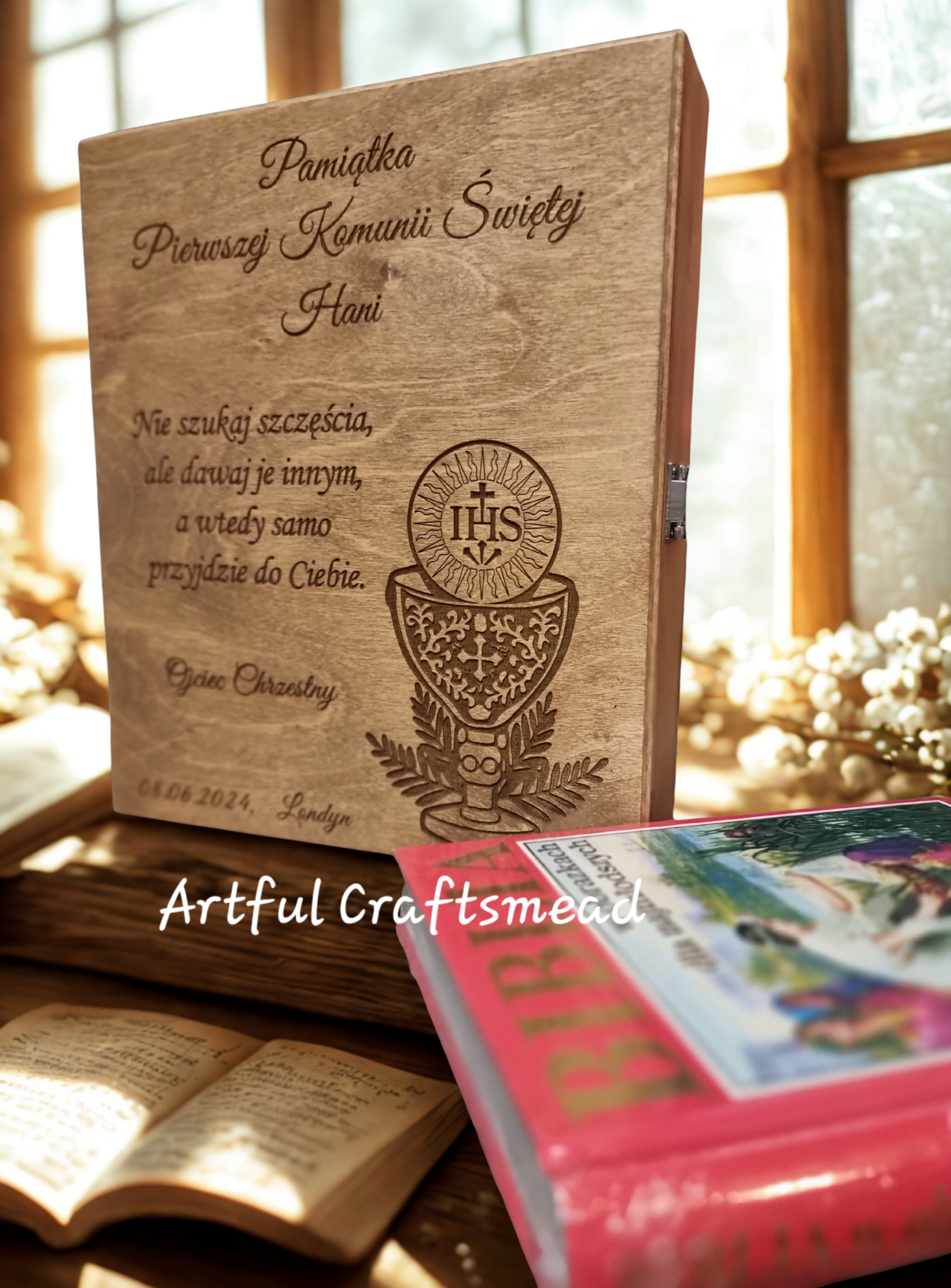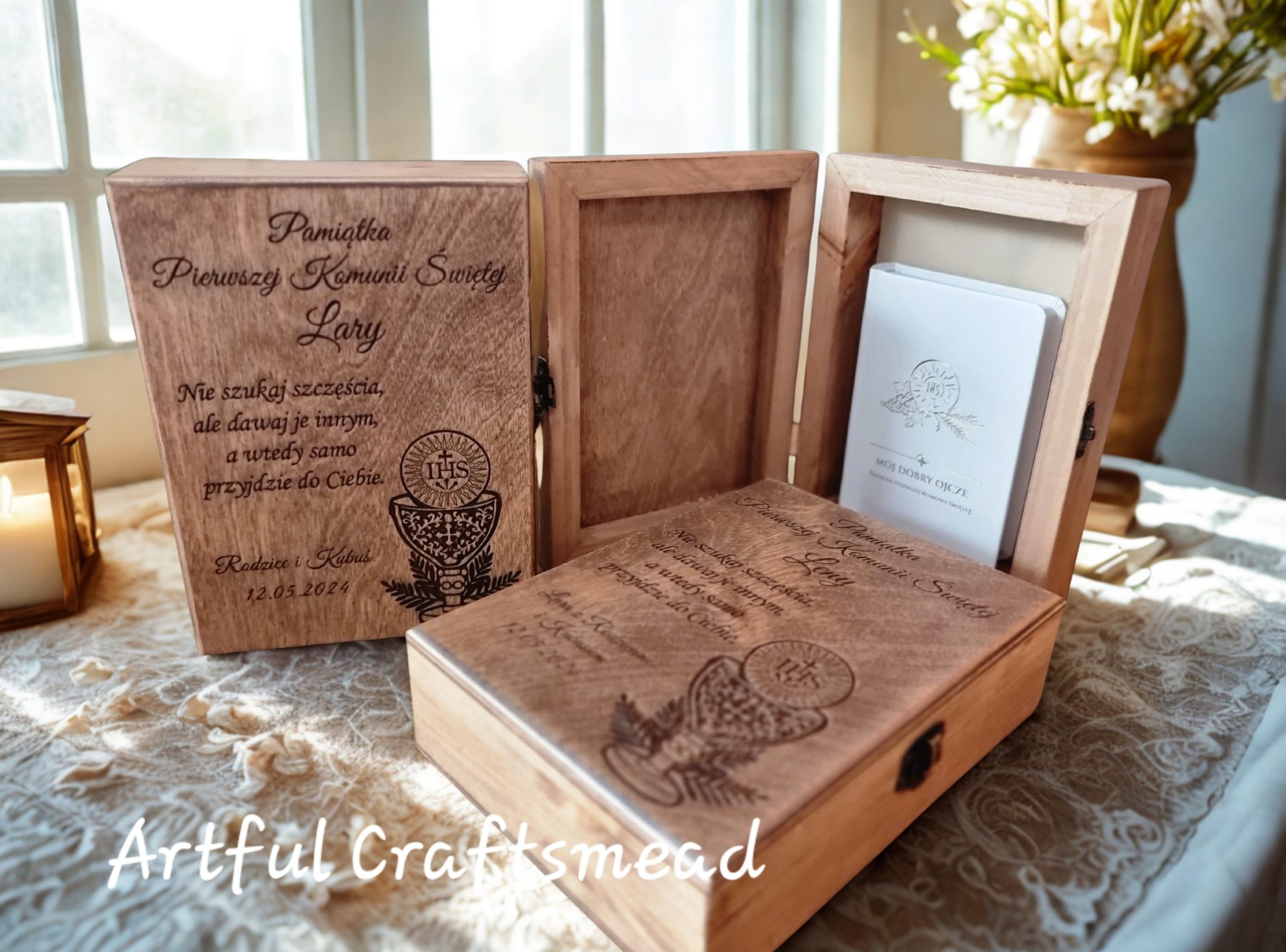 This personalised wooden box is a timeless First Holy Communion keepsake, handcrafted by us from solid wood and finished entirely by hand.