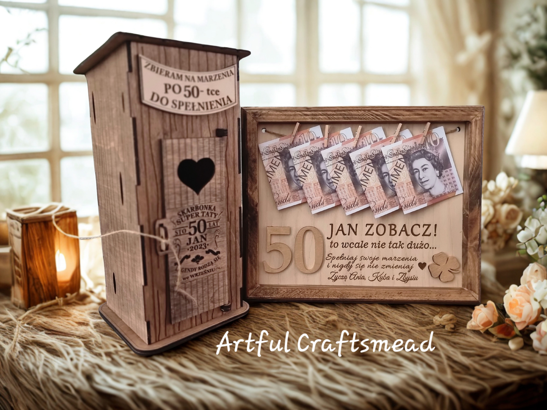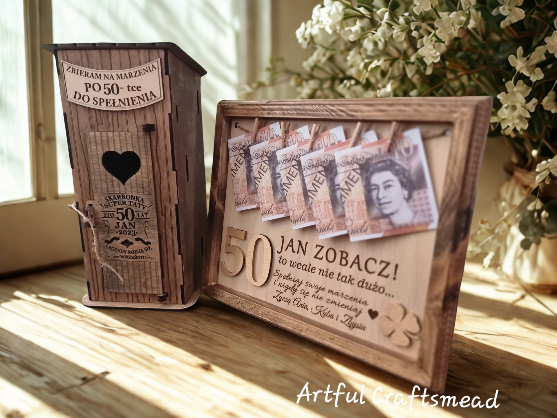 The second part of the set is a personalised wooden frame designed to hold banknotes.