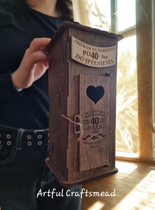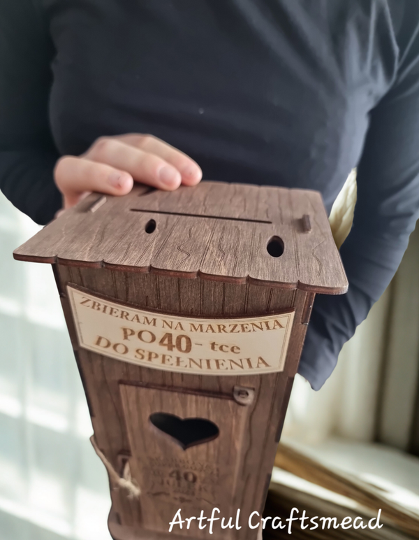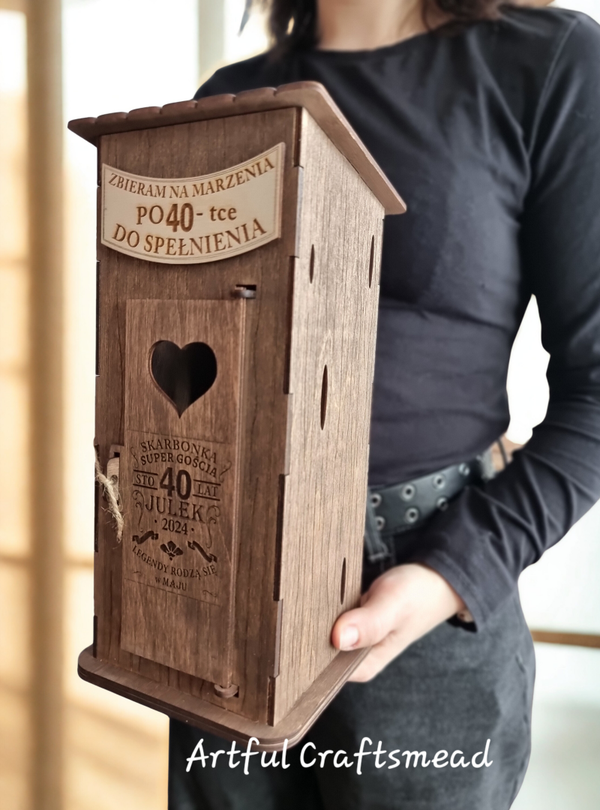 A playful wooden piggy bank shaped like a classic outdoor toilet.