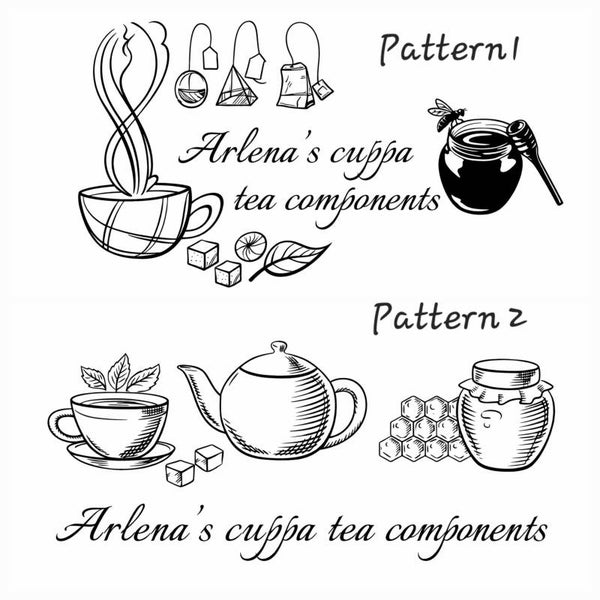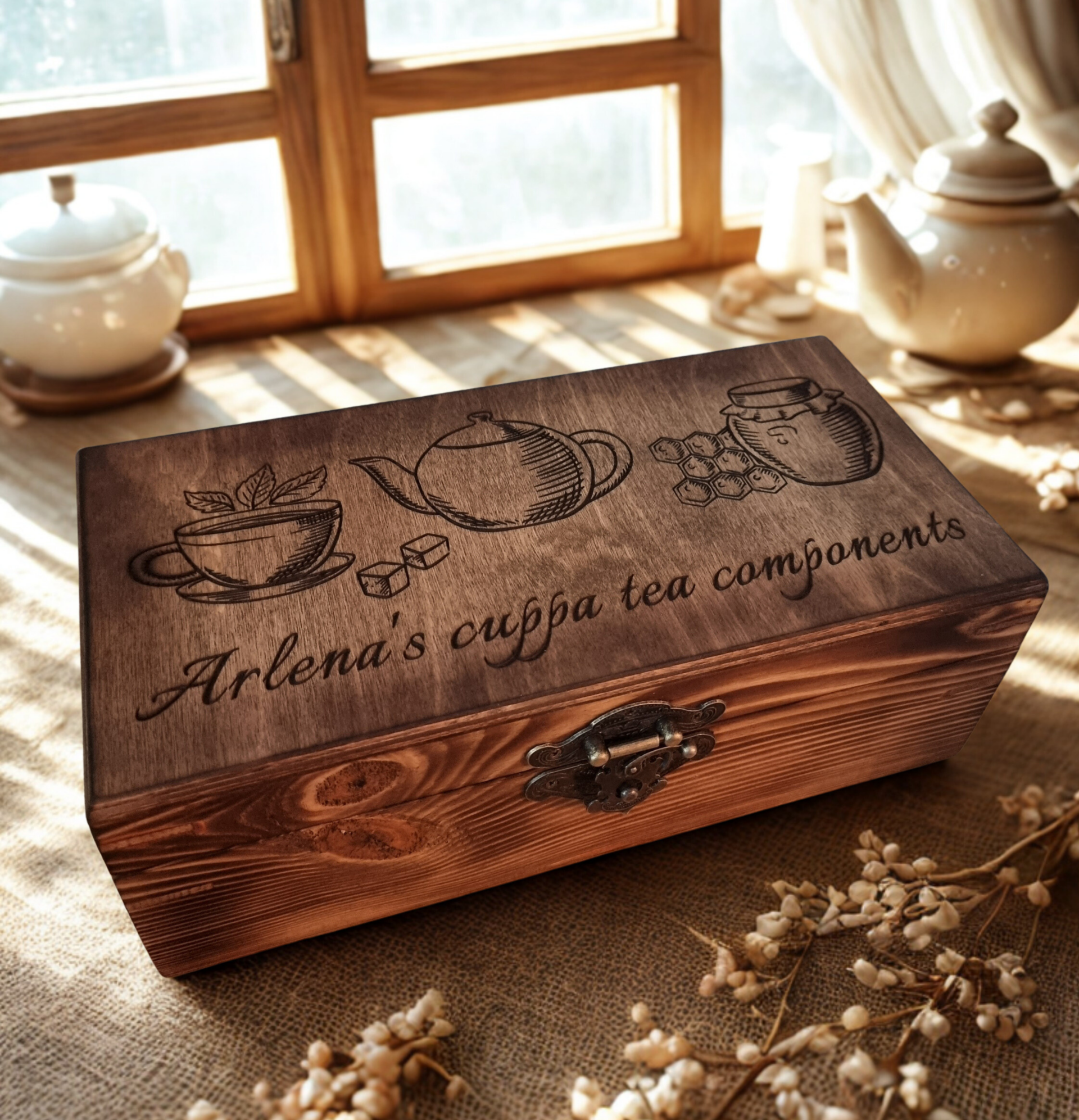 The lid is engraved with one of two tea-themed designs featuring a teacup, teapot and honey elements. The text can be fully personalised — from a simple name to a custom message or phrase.
