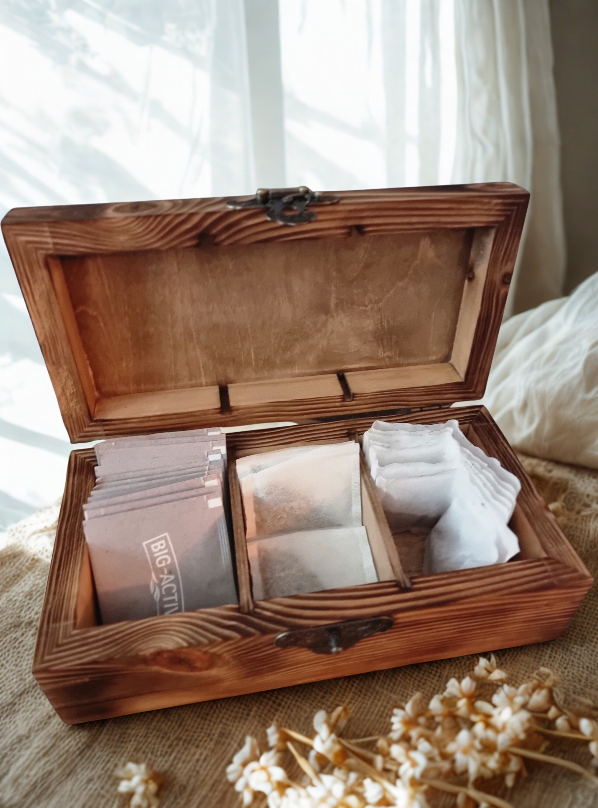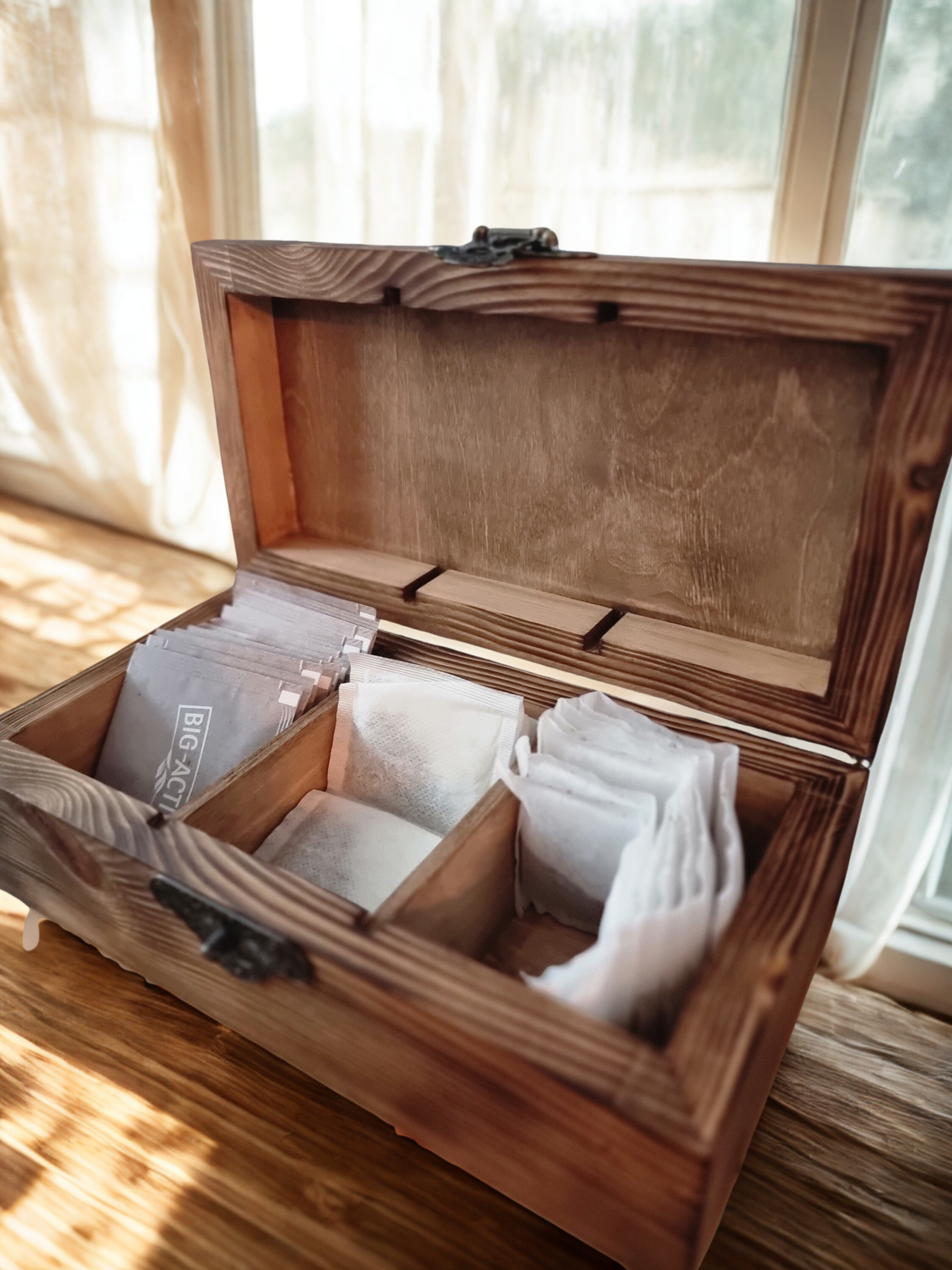 Personalised Solid Wood Tea Storage Box – Handmade 3 Compartment Tea Organiser