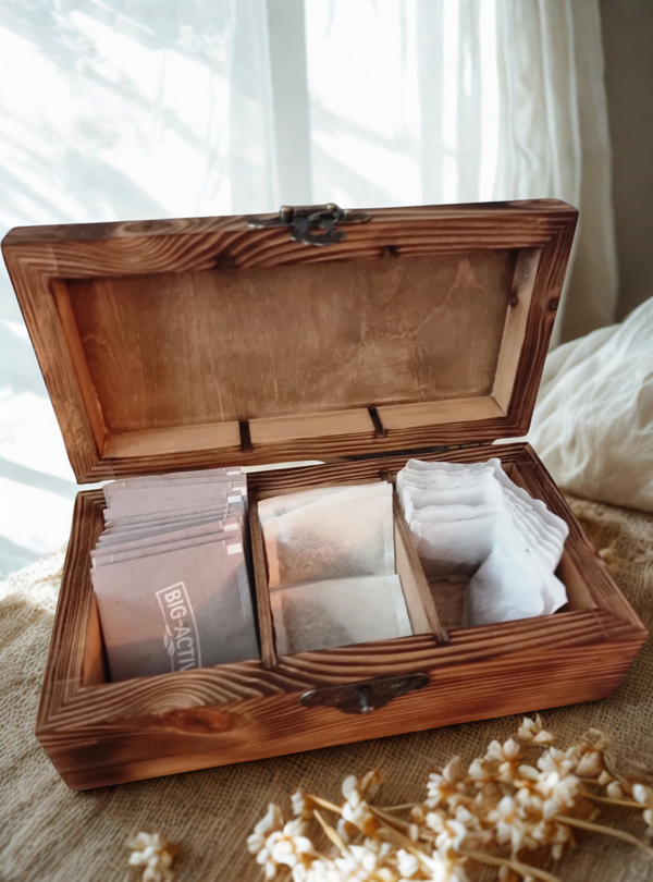 A handcrafted solid wood tea storage box designed for those who enjoy their tea ritual properly organised.
